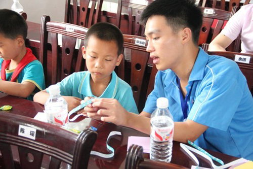 中午,我们“阳光逐梦者”社会实践服务团与留守儿童一起品尝了免费午餐之后,便开始开展活动。活动内容分为“传递梦想”、“传承梦想”、“歌唱梦想”、“携手梦想”、“放飞梦想”五个板块进行。团体游戏、励志故事、防震自救演习、折千纸鹤等多种形式的活动不仅为孩子们带去新知识、新思想和新理念,还让他们坚定了自己的“梦想”,并有了为“梦想”而努力的动力。活动期间,社管学院三下乡服务团的大学生运用专业知识进行个案辅导,将专业技能与实践相结合,做到了学以致用。活动的最后,社管学院三下乡服务团为孩子们赠送爱心文具等学习用品,孩子们纷纷把手中的红领巾为大哥哥大姐姐系上。
