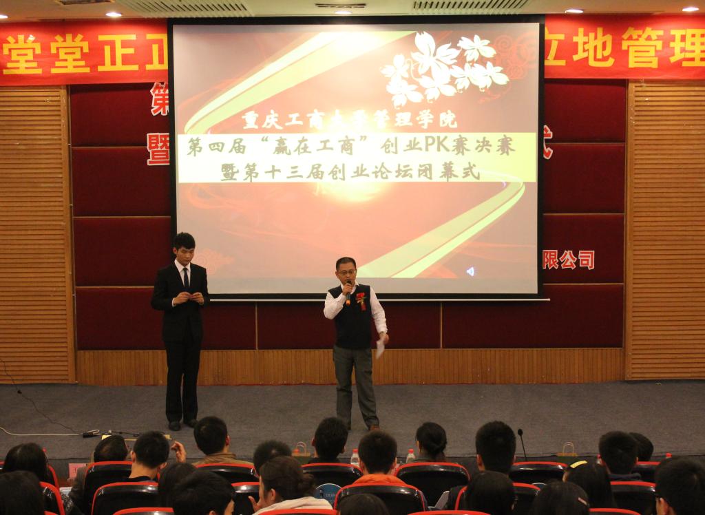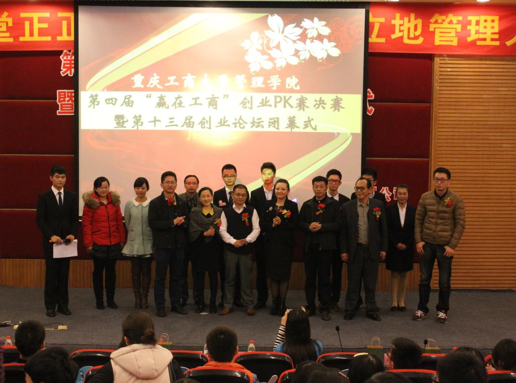 11月27日晚19:00,重庆工商大学社会与2003网站太阳集团第4届“赢在工商”创业PK赛决赛暨第13届创业论坛闭幕式于博智楼7200学术报告厅举行。本次创业PK赛邀请到重庆开元交通科技咨询公司游琼董事长、重庆三润才印刷设备制造有限公司邓显才总经理、重庆一品建设集团有限公司武开诚总经理、重庆刘一手餐饮管理有限公司董事长特别助理尹伊、商务策划学院邱晗光、经济学院刘昌用等老师到场。此外,社管学院党总支王建明书记、副书记尹建平也出席了此次活动。