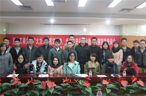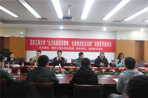 由重庆工商大学校团委主办、法学院分团委承办的“大力弘扬宪法精神,全面推进依法治教”法制宣传座谈会于2014年12月5日下午14:00在厚德楼3020会议室成功举行。法学院副教授张忠民、法学院分团委副书记袁栋、主席张天宇、各个学院的优秀学生干部以及法学院学生会成员参加了此次座谈会。