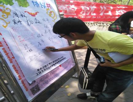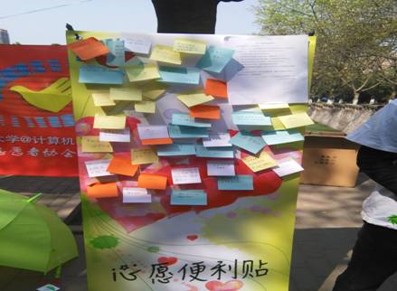 根据活动要求,志愿者们于上午10 点前,布置好活动现场,摆放好伞架,雨伞。10点整活动正式开始,志愿者们积极的向路过的广大师生进行爱心雨伞的诚信宣传,分发爱心雨伞管理细则的宣传单,介绍此次活动的目的,以及雨伞借还规定,路过的师生们也非常有耐心的听志愿者们讲解,志愿者鼓励同学们在便利贴上写下了自己对此次活动的看法以及对此次活动期望,并且在签字板上签字,写完便利贴的同学都有抽奖的机会,他们都获得了不同程度的奖励。虽然天气炎热,但志愿者们还是一直坚持着,此次活动得到了大家的肯定。