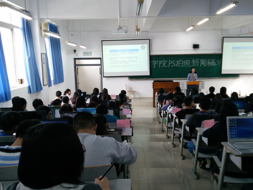 下午两点三十分,活动准时开始了。首先是新闻稿培训课程,由文新学院部长何金晏主讲,何部长从新闻的生产流程入手,将新闻稿的种类进行了细致的分类,并向同学们一一介绍各类新闻稿的格式、要求和方法,摘录了许多优秀范例供我们欣赏,让在场的干事们纷纷称扬。第二部分是由文学与新闻学院的主席游飞燕带来的PS培训,同学们纷纷拿出电脑跟着游主席手把手教学,将听到看到的知识用于实践,让同学们对PS有更加深入的认识和了解,其效果果然不同于以往。最后压轴的是文新学院分管主席蒋力力主讲的拍照、摄影培训,蒋主席用其生动有趣的讲解让到场人员听得津津有味,为同学们介绍了市场上最普及的两个品牌的单反,以此为据为同学们分别比较了它们各自的优缺点以及其具体操作步骤。台下的干事们也纷纷表示:“蒋主席教授的摄影方法和拍照技巧简直是为我们这些新干事们指点了迷津。”