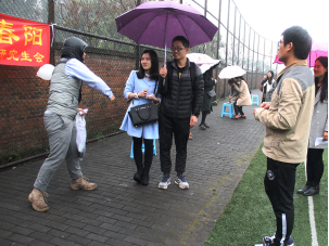 虽然天公不作美,同学们参与的积极性依然很高。尤为逗乐的是“瞎子贴鼻”,在参赛者观察好纸板上所画的没有鼻子的卡通人物的位置后,工作人员为参赛者蒙上眼睛,去三米外为卡通人物贴上鼻子,贴对位置者视为过关。其中一位参赛者蒙着眼睛一直走到纸板后面,个头高的参赛者把鼻子贴到卡通人物的额头上……场上传来阵阵欢笑声。