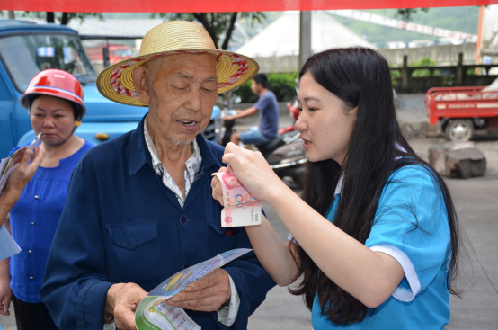 宣讲会紧扣基层群众金融需求,提供多层次的咨询服务。在宣讲过程中,各个年龄层对金融知识的关注点各不相同,20-30岁的返乡青年对农业创业方面的政策扶持和融资平台尤为关注;30-50岁的中年人则更加关心商业保险产品的种类和投保途径;50岁以上的老年人对金融诈骗知识相对匮乏。面对这些问题,服务团成员和重庆农村商业银行龙桥分理处工作人员运用专业知识,配合手机银行、支付宝等手机理财软件进行演示,一一为其答疑解惑。为有创业意愿的人普及如众筹、第三方支付等新兴金融工具相关知识,让更多更全面的商业保险种类进入到中年人的视野,同时也用钞票现场展示“一看,二模,三听”的假币识别方法。