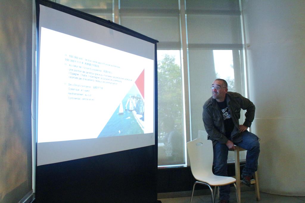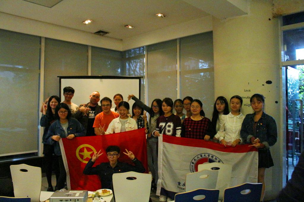2016年10月18日下午5点, “香颂浪漫的法国”主题团日活动于国际商学院咖啡吧正式开展。我校国际商学院2015级法语一支部、外教Emmanuel和Pière以及重庆各高校通过抢板凳的方式来参加的同学共同参与了本次团日活动。同时,2016年十佳主题团日“抢板凳”活动展演的评委也到达现场。