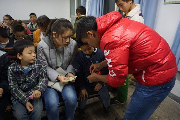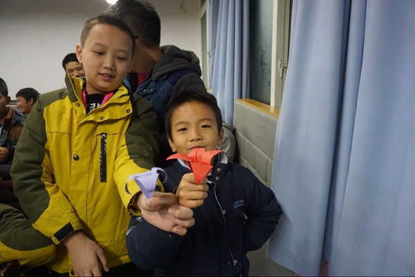 下午5:30,志愿者们抵达活动现场,开始紧锣密鼓的准备工作。很快,在老师的组织下,孩子们也回到教室里。看到长期陪伴自己的志愿者,孩子们很激动,牵着志愿者的手表达自己的兴奋之情。活动采取一对一教学的形式,每一个孩子都有一个志愿者来陪伴和指导。孩子们在志愿者的带领下学做折纸,百合、郁金香,鲜艳的花朵在他们的手下朵朵绽放。在自由折纸环节,很多孩子将自己折出的千纸鹤、桃心和花朵,送给了陪伴自己的志愿者。温暖的气息溢满全场。