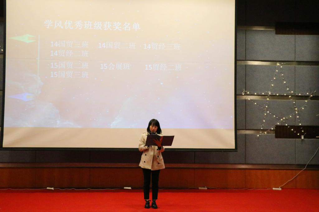 经济学院为营造奋发向上的学风氛围,鼓励青年学生成长成才,将学生课堂出勤、学生考试不及格门次、英语各项资格考试通过率、学生违纪情况、文明寝室获得情况、学业警示情况、学生各类课题申报情况、学生个人参加活动情况、学生发表论文加分、考取与学业相关的从业资格证等十项指标得分排序,评选出上一学期每个年级的学风优良班集体一(1个)、二(1个)、三等奖(2个),共计12个班集体。在无补考班级和寝室中,评选出双优班级3个,学习优秀寝室若干。由经济学院宋瑛副院长宣读获奖名单,经济学院教务办主任严艳老师及国贸系主任蒋兴红老师,贸经系主任杨海丽老师,杨军副教授为获奖班级及寝室代表颁发获奖证书。