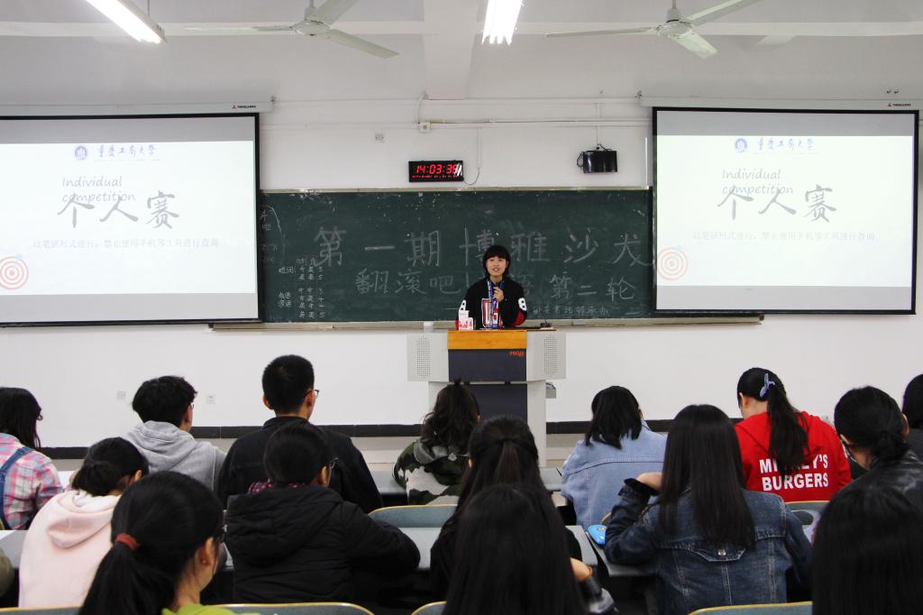 为了提高同学们对英语的学习热情,浓厚学习氛围,2017年10月22日下午两点,由重庆工商大学通识学院分团委、学生会主办,素拓部承办的“翻滚吧!英语”主题沙龙积分赛活动在兰花湖片区广智楼20307教室如期举行。