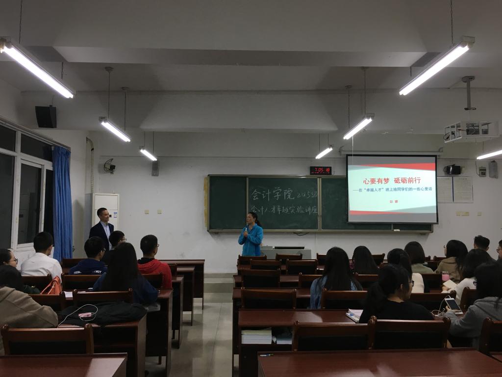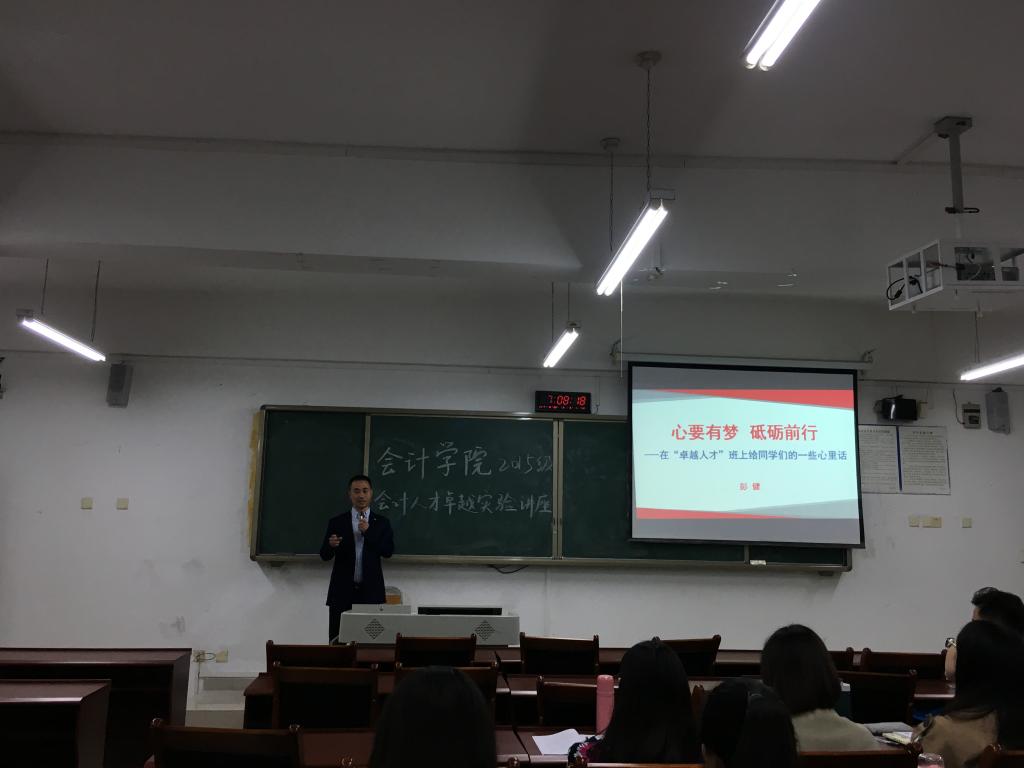 2017年10月20日晚,会计学院2015级卓越人才实验班在博智楼7603举行了主题为“心要有梦,砥砺前行”的讲座。主讲人是中国人寿保险重庆分公司副总经理彭健。其中卓越会计人才实验班和财务总监实验班共56名同学聆听讲座。