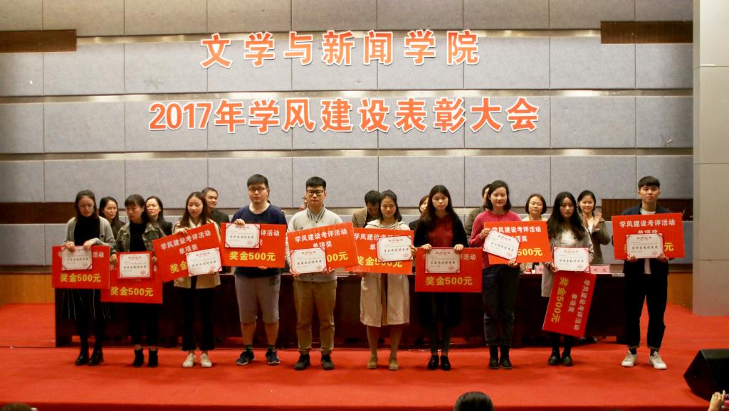 本次大会,以14级汉文班为代表共9个班级荣获“学风建设综合奖”; 14级新闻二班、15级新媒体班则共同荣获“学风建设单项奖”;14新媒体班、15新闻一班获得“学习成绩优秀奖”荣誉称号;14级汉文一班、15级汉文班收获“图书阅读优秀奖”荣誉称号;14级广告一班、15级广告一班荣获“学科竞赛优秀奖”;14级新闻一班、15级汉文班班级荣获“公寓表现优秀奖”称号。院全体领导共同向获奖的先进班集体颁发了荣誉证书和奖金。表彰会上,15级汉文班班长李昕煜作为获奖班级代表向在座人员分享获奖感受,他指出“一个班级的责任、习惯、氛围最为重要”。随后,文新学院院长蔡敏上台讲话,他结合 “十九大”精神,强调学院未来发展要做到 “以评促改、以评促建、以评促强”,并对同学们提出期望,希望大家在评估中表现优秀 拿出好成绩,展现文新学子的精气神。