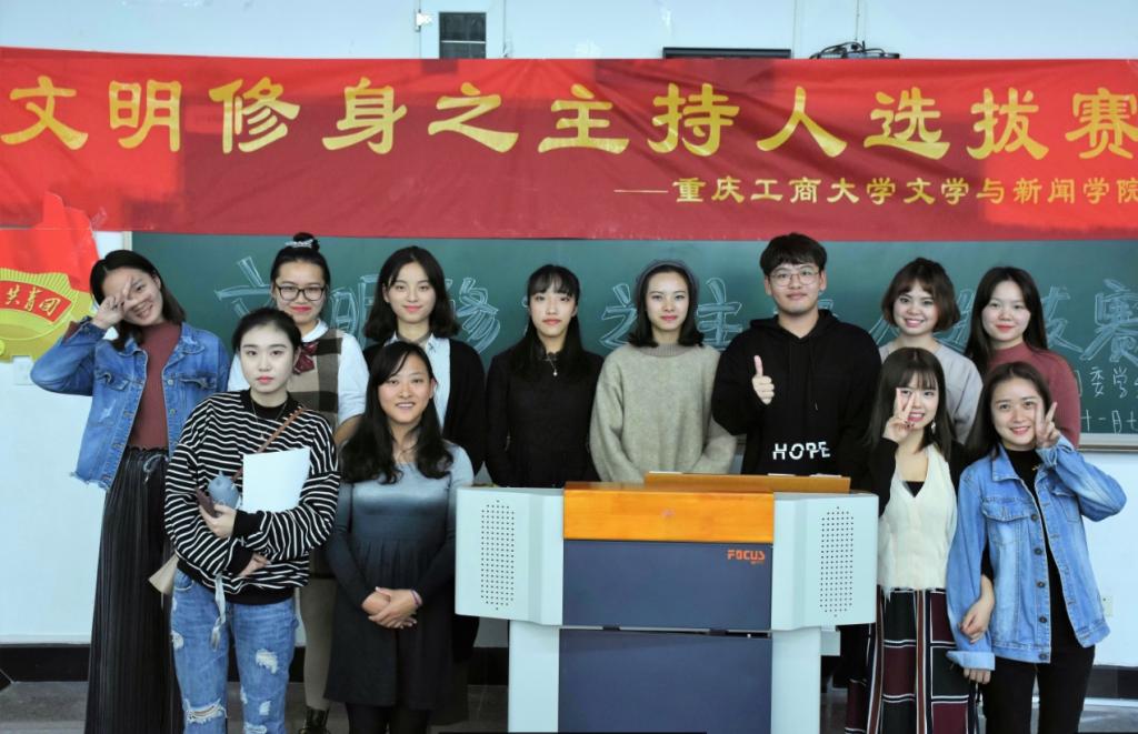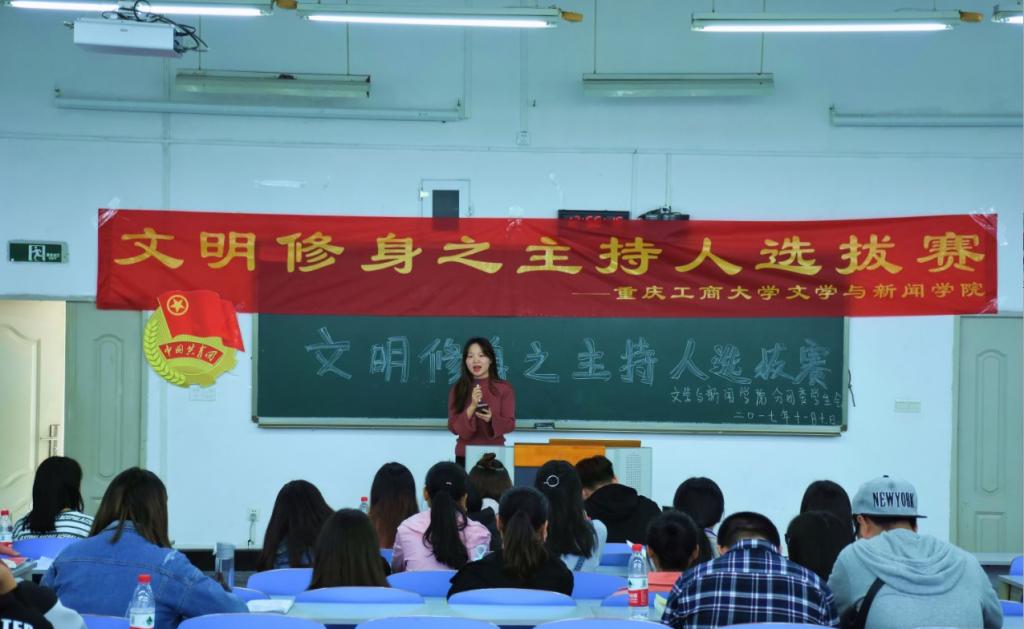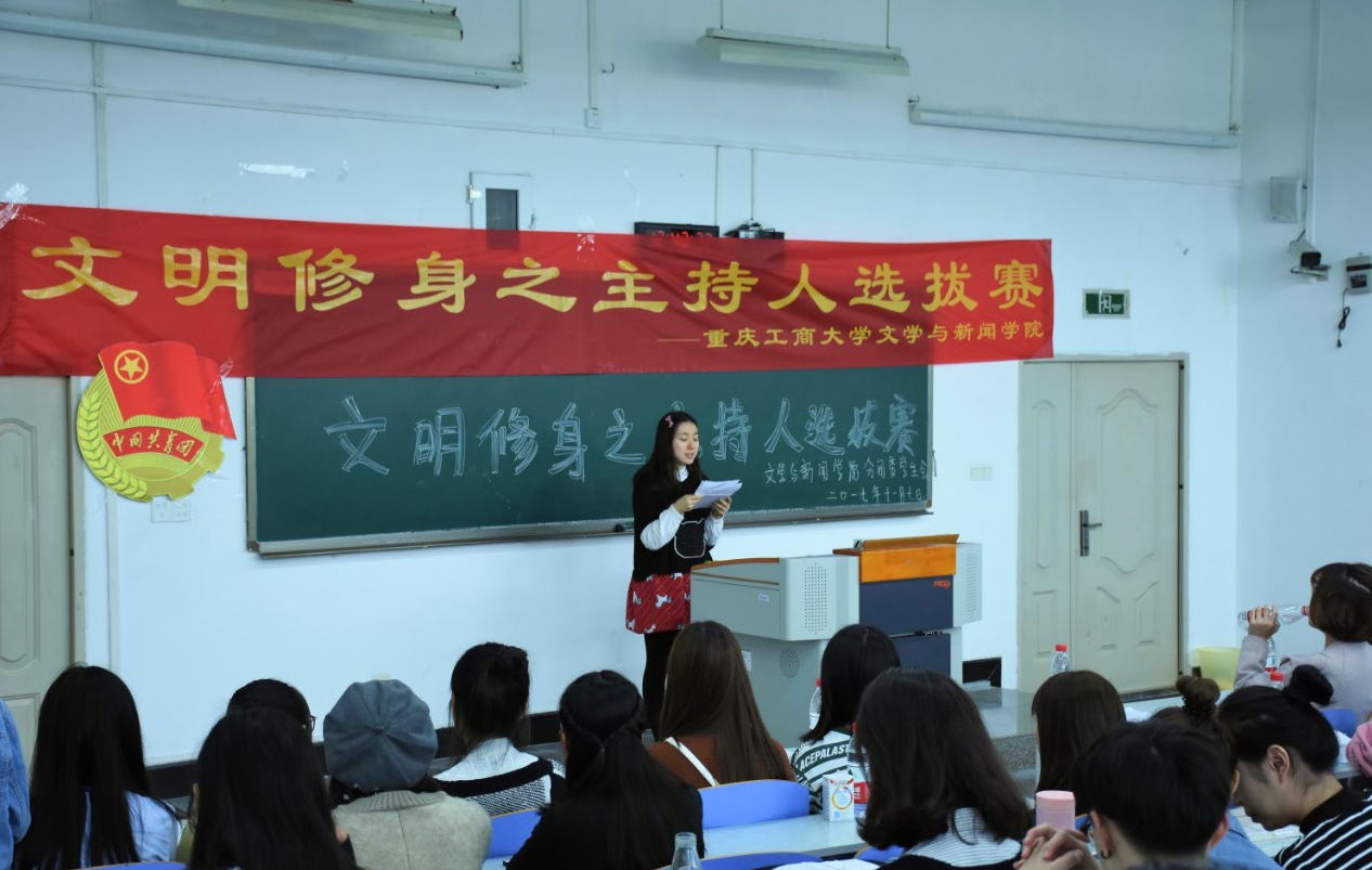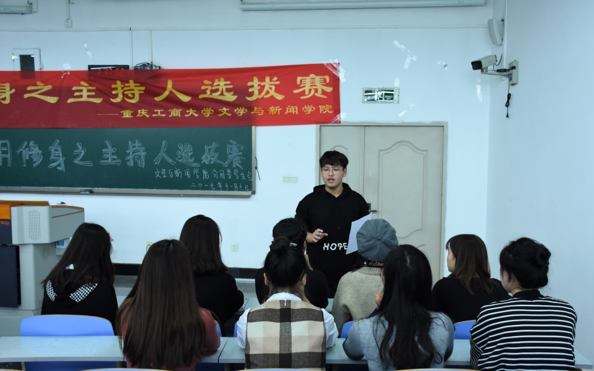 11月9日,重庆工商大学文学与新闻学院分团委学生会在南岸校区90309顺利举办文明修身主持人选拔赛,校播音主持团前团长江蕊弘、现团长谢丝丝出席担任本次大赛评委,并在赛后对各位选手进行了点评指导。