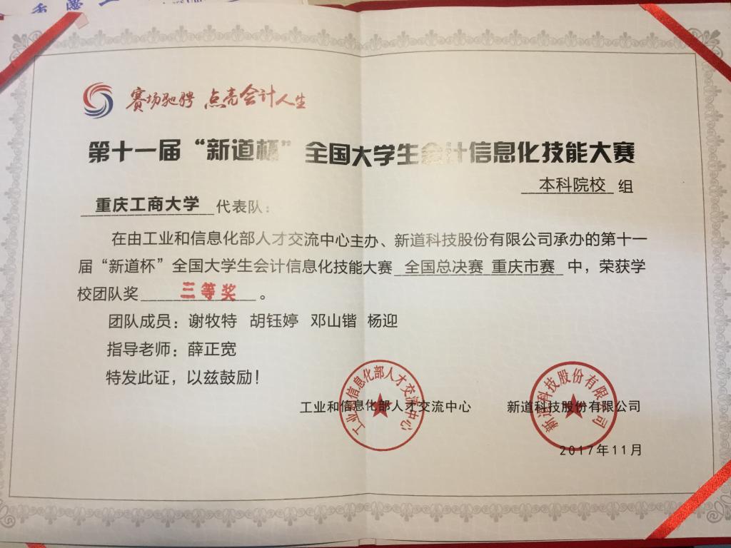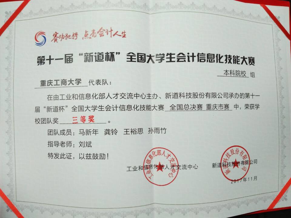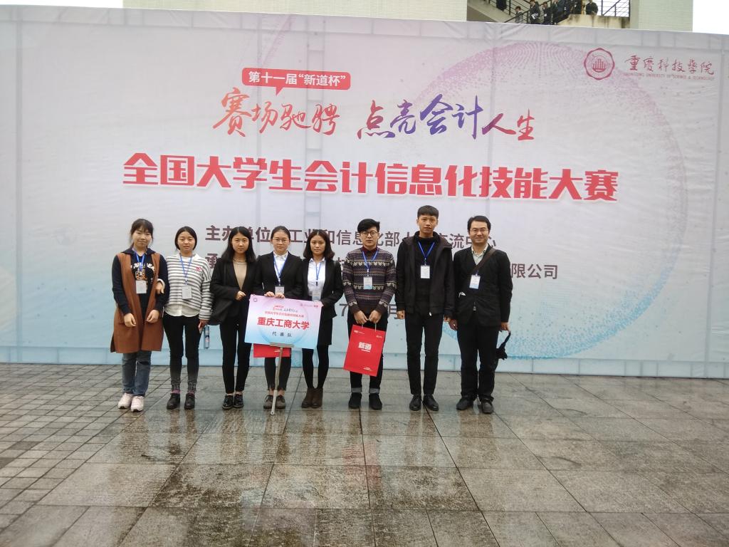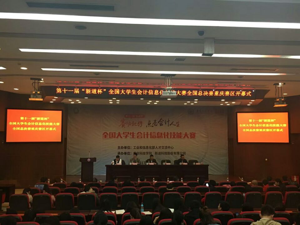 2017年11月18日上午,第十一届“新道杯”全国大学生会计信息化技能大赛重庆市赛暨全国总决赛在重庆科技学院博学楼正式举行,会计学院共派出两支参赛队伍,由薛正宽老师和刘斌老师带队,共8位同学参赛,他们是A队的谢牧特、胡钰婷、杨迎、邓山锴以及B队的马新年、王裕思、龚玲、孙雨竹。