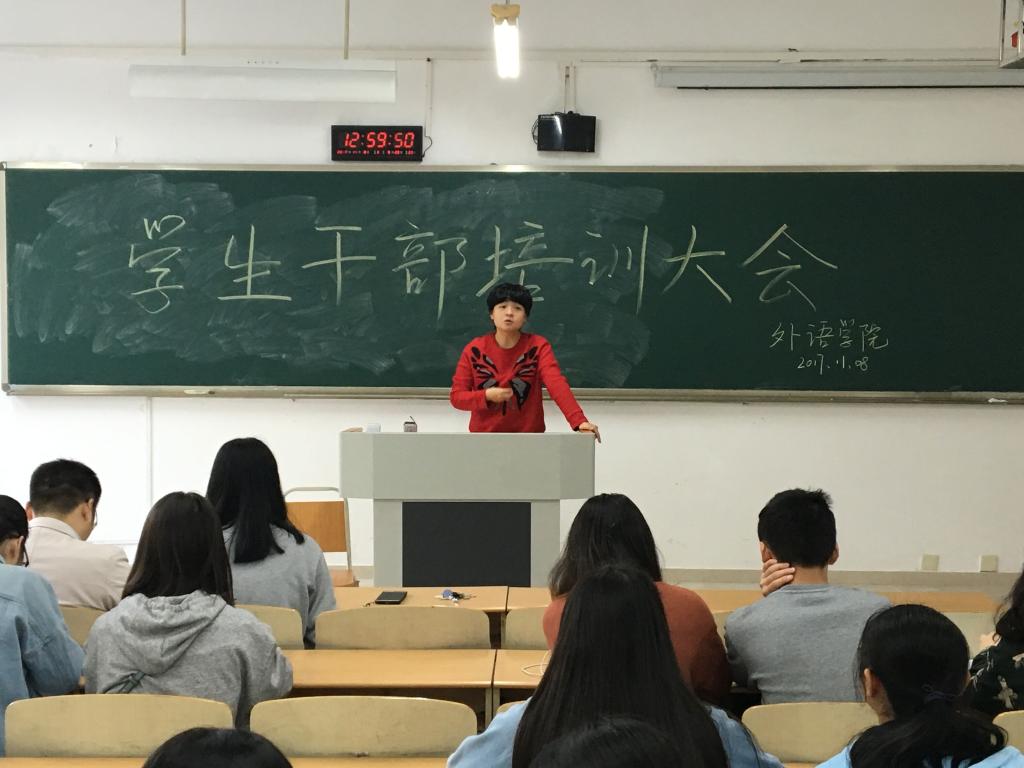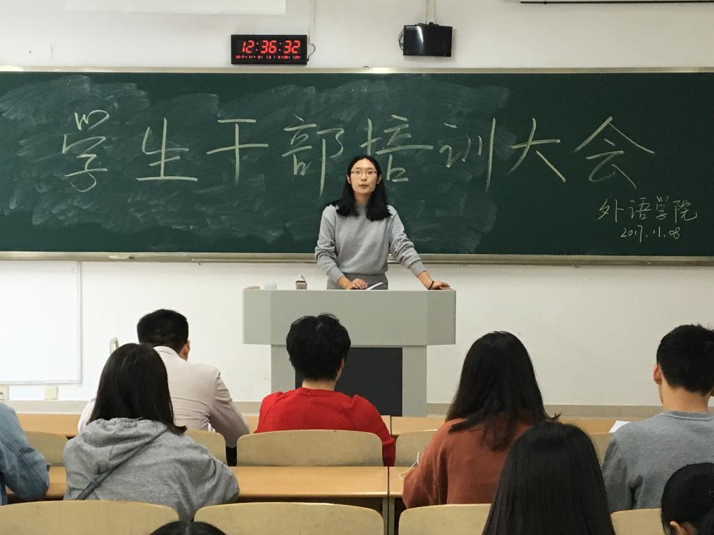 重庆工商大学外语学院于2017年11月8日中午12时30分在南岸校区广智楼07210教室召开了学生干部培训大会。到场人员有外语学院党总支副书记陆嘉老师、外语学院分团委书记黄志婕老师、外语学院党员服务站指导老师丁亮老师、外语学院分团委学生会、党员服务站的全体干部以及各年级的班长、团支书。
