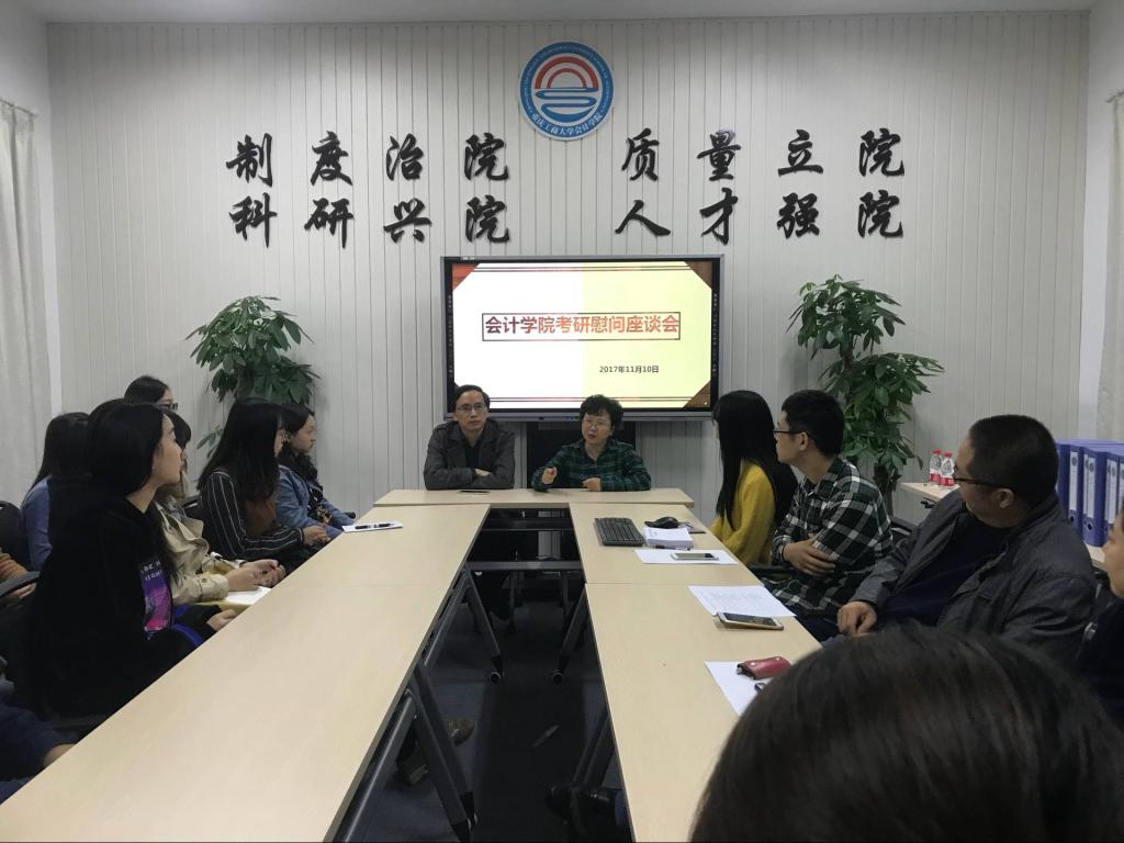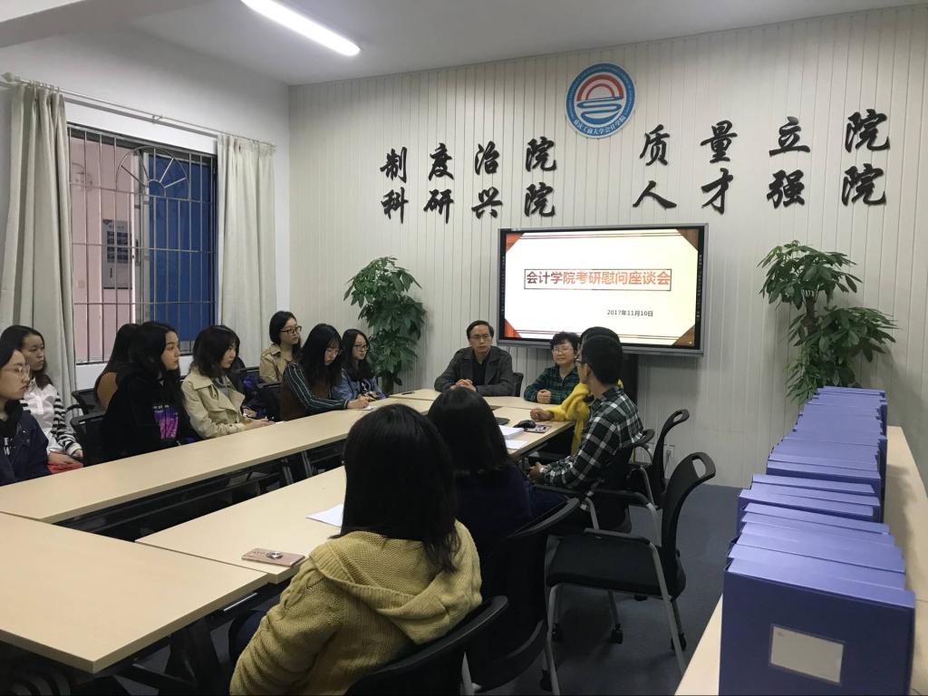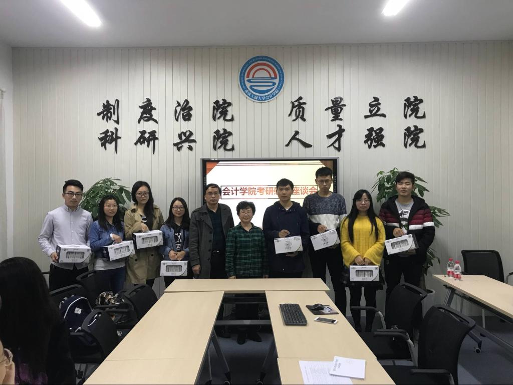 2017年全国研究生考试将至,会计学院领导为照顾考生情绪,适当放松考生的临考压力,为各位考生鼓劲加油,于今日上午11点在南岸校区明德楼2016室举行了一场考研慰问座谈会。座谈会共有29人到场——罗惠玉书记、尹建平副书记、四位老师、一位分享心得的13级学姐以及二十二位学生代表。