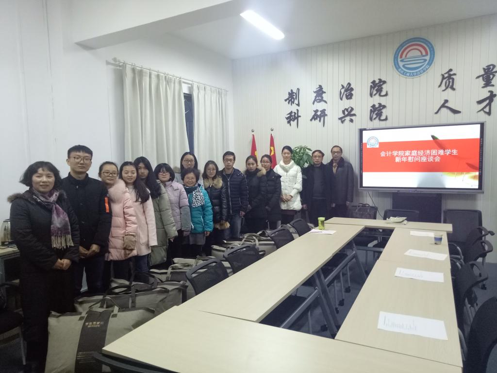 2017年12月27日下午17点20分,会计学院在南岸校区明德楼2016举行了会计学院家庭经济困难学生新年慰问座谈会。出席此次会议的有会计学院分党委书记罗惠玉、副书记尹建平、副院长程文莉、副院长黄辉,学团办主任刘斌、全体辅导员及家庭经济困难学生代表。