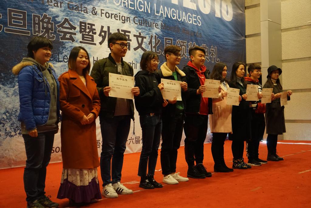 除了精彩夺目的节目,此次晚会上,还有激动人心的颁奖环节。周琳教授和陆嘉书记分别为获得林肯选修课结业证书的同学以及在学风建设先进个人和集体评选中的荣获标兵称号的个人和集体颁发荣誉证书;邹莉老师和罗媛媛老师分别为在外语文化月之写作、翻译和听写比赛以及法语歌曲暨戏剧大赛中获奖的同学颁发奖状。