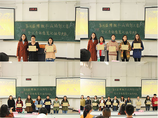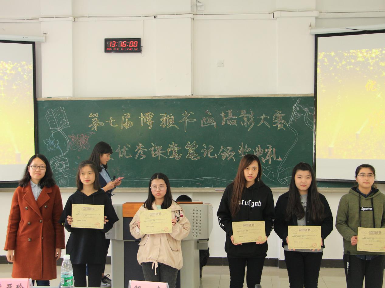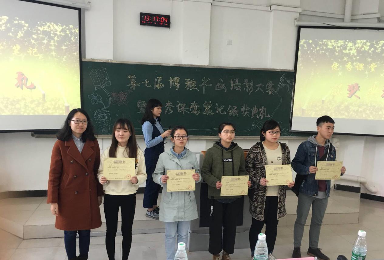 2018年3月9日中午12:40,由重庆工商大学通识学院(兰花湖)分团委、学生会主办,宣传部、学习部联合承办的第七届博雅书画摄影大赛暨优秀课堂笔记颁奖典礼在重庆工商大学兰花湖片区广智楼20211教室如期举行。通识学院党总支副书记邹奇老师、分团委副书记李亚玲老师、分团委宣传部主席周诗蕾、学习部主席谢旻月、各班学习委员以及获奖同学出席了本次颁奖典礼。