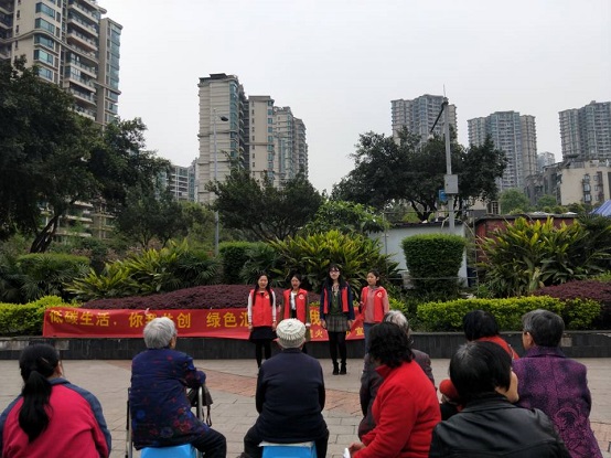 在汇雅社区广场,参加此次活动的主要是老人和小孩,为了能让他们更好地认识环保,志愿者们以歌曲、小品、宣讲等形式来宣传环保。在轻松愉悦的氛围中,居民们不仅收获了快乐,还了解了何为环保,如何进行环保,同时认识到了环保的重要性和迫切性。现场的王奶奶告诉志愿者,他们很喜欢志愿者为他们宣传环保的表演形式,并为此感到高兴,而且通过志愿者的讲解他们也了解到了在生活中如何去做环保。