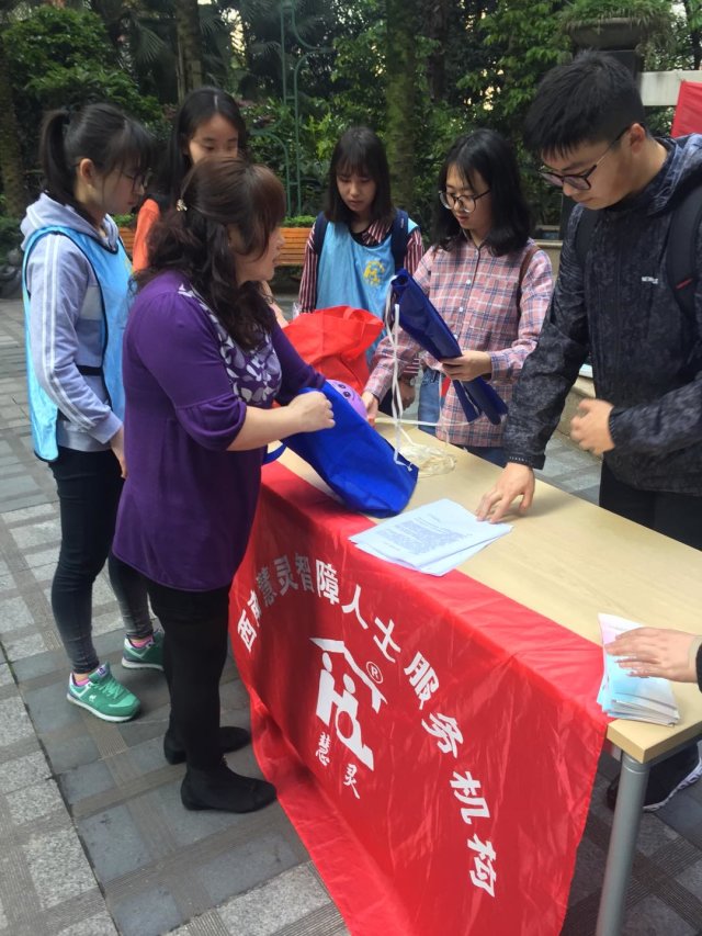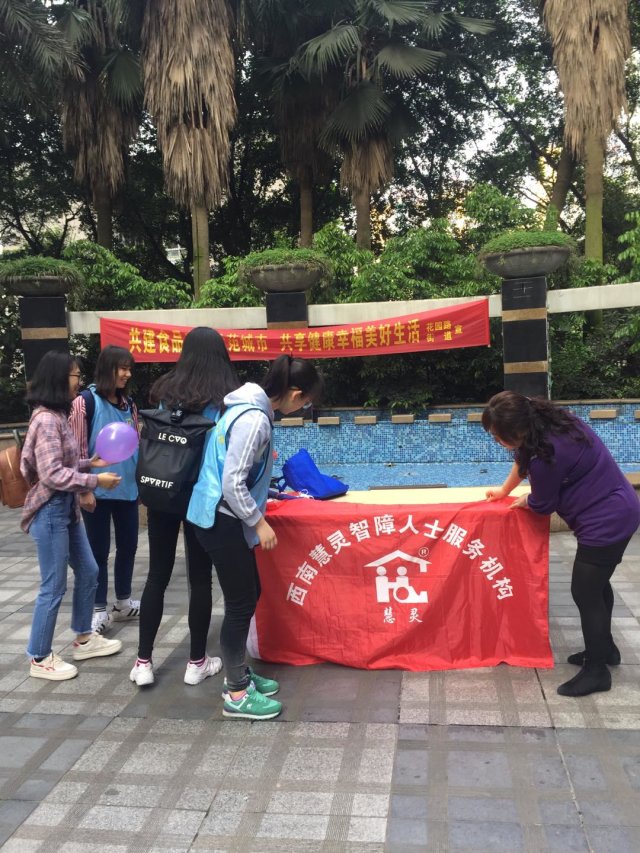 此次活动是由重庆市南岸区慧灵心智障碍人士服务中心主任陈亿负责,昌龙城市花园能代物业和重庆工商大学志愿者协助活动的开展。在昌龙城市花园大门中庭首先由工商大学志愿者在大门中庭周围分发气球给小朋友,并通过发放纪念品的方式吸引居民。当人群汇拢时,志愿者们便向来往居民解释慧灵残障人士机构服务和介绍自闭症全体,并向居民发放宣传资料。活动是志愿者和部分自闭症患者一同参加的,患者在志愿者的陪同下,文明礼貌面带微笑,慢慢打开心扉接触陌生人。活动最后陈主任将服务机构中自闭症患者做的手工成品进行展示,并设置一个游戏区,回答问题并获得赠品,居民,志愿者和自闭症患者都很开心的沉浸其中,似乎相互之间没有任何的隔阂和羁绊,相互之间似乎有什么东西让彼此越靠越近。