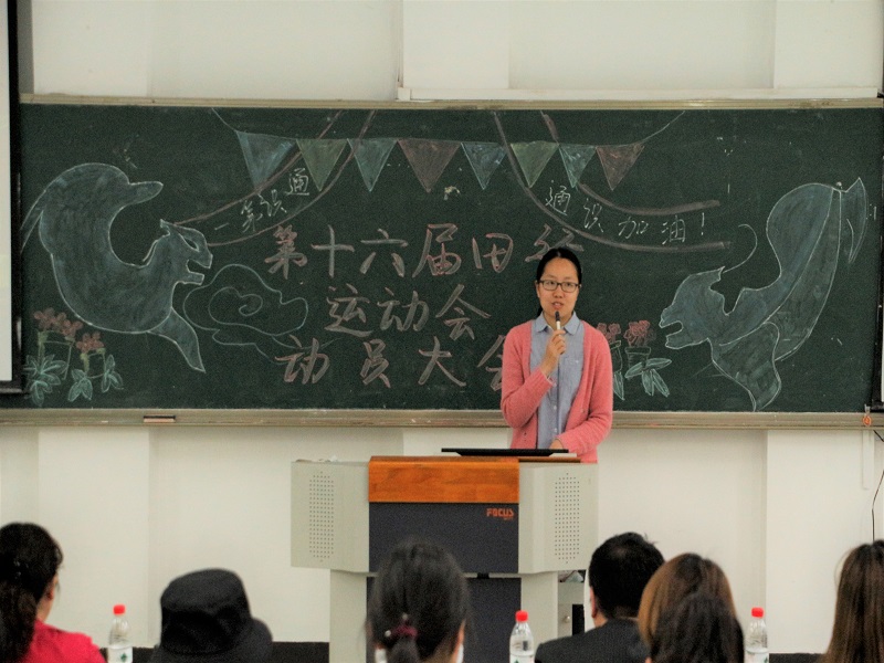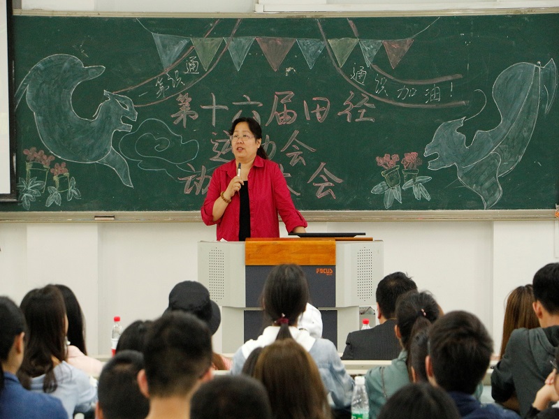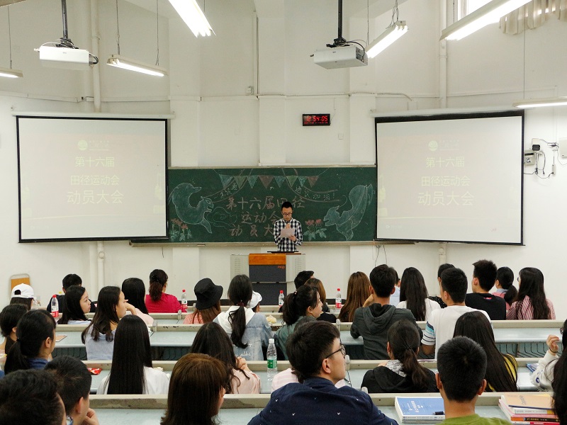 为迎接即将到来的春季校运会,2018年4月10日中午12:40,由重庆工商大学通识学院分团委、学生会主办的第十六届校田径运动会动员大会在兰花湖片区广智楼20204教室举行。通识学院院长兼党总支书记包晓玲、党总支副书记邹奇、辅导员罗观、黄栗樊少华等老师。及本届运动会参赛全体运动员、方阵、体操、啦啦操队代表以及分团委学生会主席团参加了动员大会。
