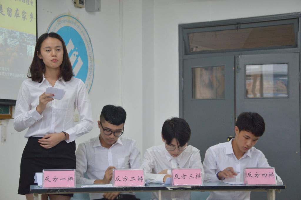 本次比赛共分立论,盘问,驳论,攻辩,自由辩,总结陈词六个环节,双方辩手以“当代青年追寻人生价值过程中的心理嬗变:去向远方/留在家乡”为辩题展开辩论。立论环节双方提出观点,步步深入;攻辩环节,辩手以周密逻辑发问和反驳,字字铿锵;结辩环节,各方辩手言辞简练,立场明确。双方辩手你来我往,互不相让,以文明之态,辩前程去向。他们用幽默诙谐的语言表达,生动形象的举例比喻,镇定自若的参赛风度,天衣无缝的团队合作,赢得在场观众的阵阵掌声。辩论结束后,评委开始点评,首先校辩论队队长张桂旗赞扬了本场比赛各位辩手的优秀表现同时也针对辩题中双方辩手遗漏的问题进行了指点。之后杨宁老师进行点评,他提到:大学生心理健康,擅辩就是其中一项,选择这样一个辩题就是想让同学们思考理想就业的真正含义。他表示本次活动切入主题,对同学们的现实生活有良好的指导意义。