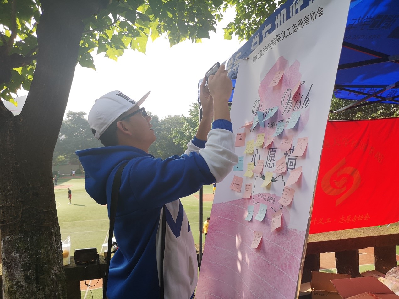 自2013年与营盘村小学建立志愿服务关系至今,经济义协与山区孩子们一起成长。志愿者通过参加比赛、线上宣传的方式,长期对营盘村小学进行宣传帮助,在政府的帮助下,现在孩子们已经有了全新的教学楼。同时,志愿者依然保持对孩子们的关注,希望通过校园义卖的方式来帮助他们。在志愿者的热心倡导下,校园里的不少师生及其他人员都积极地参与到此次爱心活动中。尽管天气已经转凉,同学们参与活动的热情却并未受到影响,前来购物订货、捐款留言的同学络绎不绝。每卖出一件商品、写下一条留言、收到一次捐款,志愿者们都能从中感受到同学们满满的心意,一点一滴汇成爱的暖流传递给营盘村小学的孩子们。