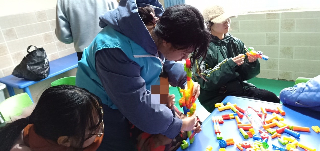 又是一个清晨,志愿者们再次来到乐一融合幼儿园,在老师的安排下,大家开始了分头行动。一部分同学打扫园区内的卫生,为小朋友们的健康做好防范;一部分同学在老师带领下来到教室里教成年班的孩子们系鞋带,帮助他们掌握基本的生活技能。其余志愿者则陪伴小班孩子们玩耍,教他们搭积木,画画,打开孩子的另一个世界。在志愿者的陪伴下,孩子们或欢笑奔跑,或自言自语,用自己的方式和世界对话。吃过午饭后,孩子们与志愿者一起洗刷碗筷,不时传来的嬉笑让刷碗也变得有趣以来。下午,志愿者们分成两批,陪中班孩子在教室里看启蒙教育片,协助老师管理纪律。志愿者们希望通过此类活动,增加孩子们与他人交流的机会,最终能让这些孩子尽可能地适应与他人相处,从而改善自闭症状。