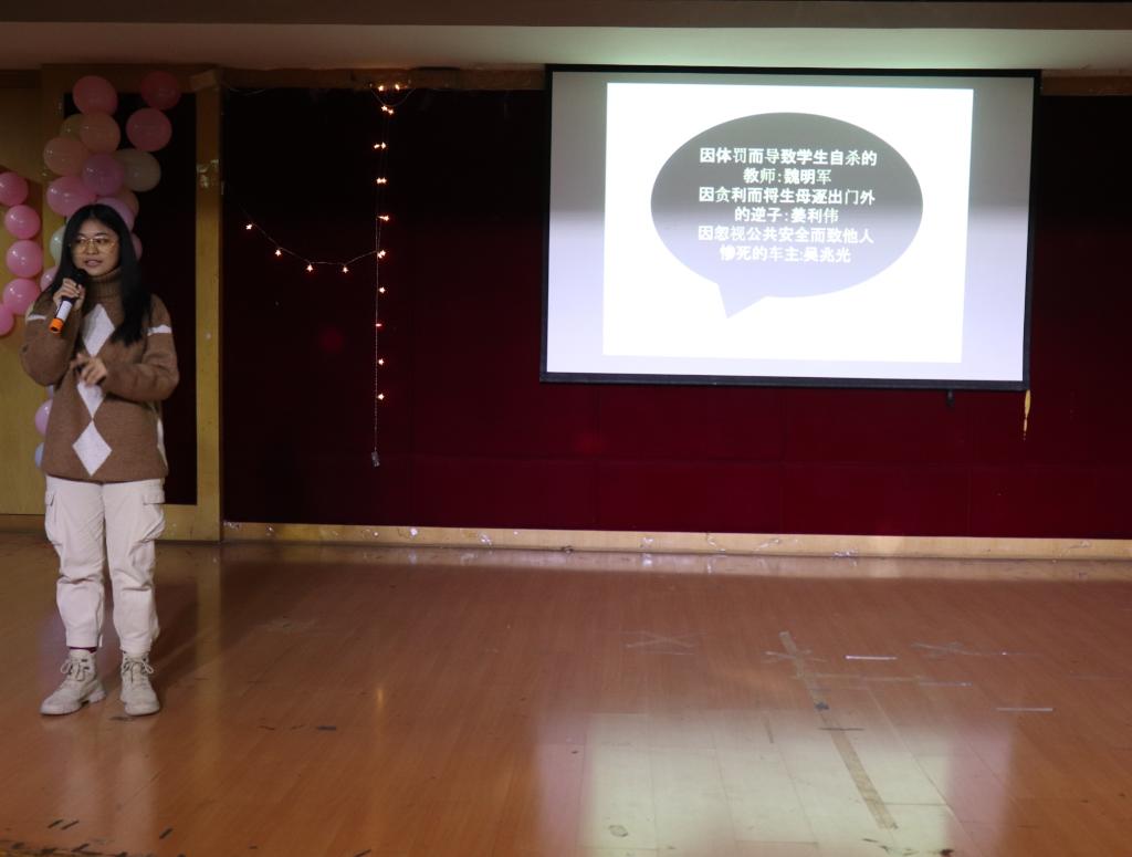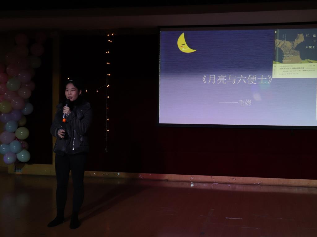 本次读书交流分享大会以演讲为主、PPT演示为辅的方式进行。本次大会交流的书籍不仅有独特的《月亮与六便士》、浪漫自在的《仓央嘉措诗选》,还有被重新解读的《西游记》和体现国民情怀的《周恩来——永远的榜样》。除此之外,《民国风度》让我们了解到那些被我们遗忘的人以及遗忘的精神;《菊与刀》让我们意识到道德约束力来自外界,而非自身;《心理罪——城市之光》让我们自省,明白了舆论对社会的危害;《外婆的道歉信》让我们热爱故事、热爱生活,一本本经典名著的解读带给全体同学极致的视听盛宴。在读书交流的期间,本次活动还进行了“人物在书中”以及“知识竞赛”的游戏环节,提高了同学们的积极性,增加了本次活动的趣味。在活动最后,由宣传部(记者团)分管副书记刘琰皎以及素拓部分管副书记邓春玲为书籍分享者们颁奖。