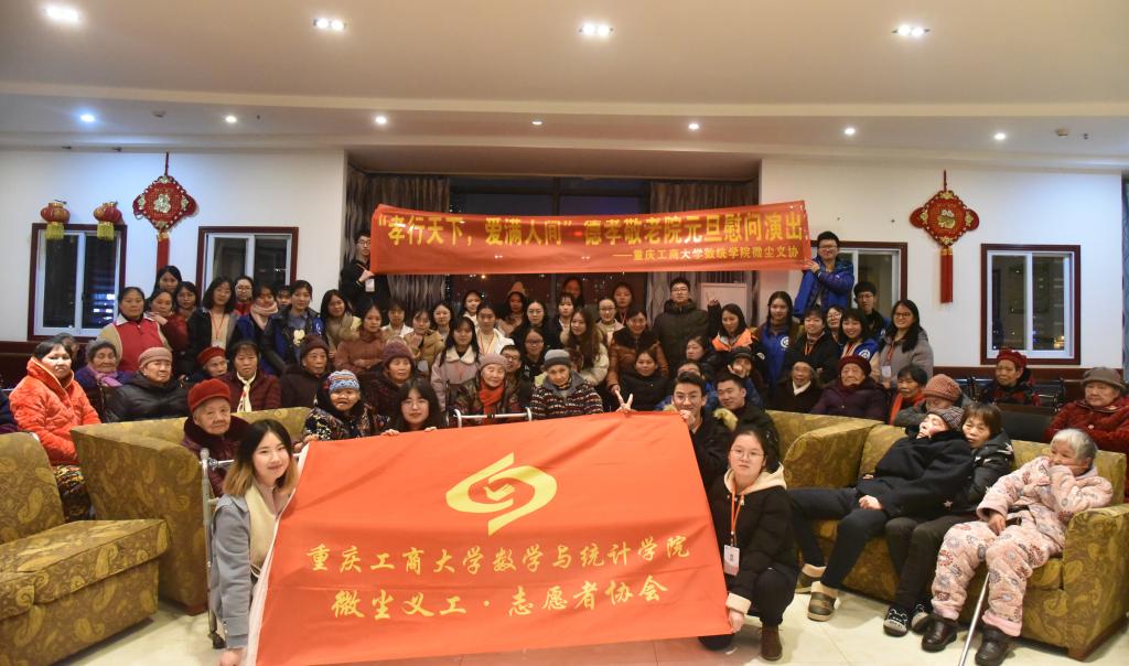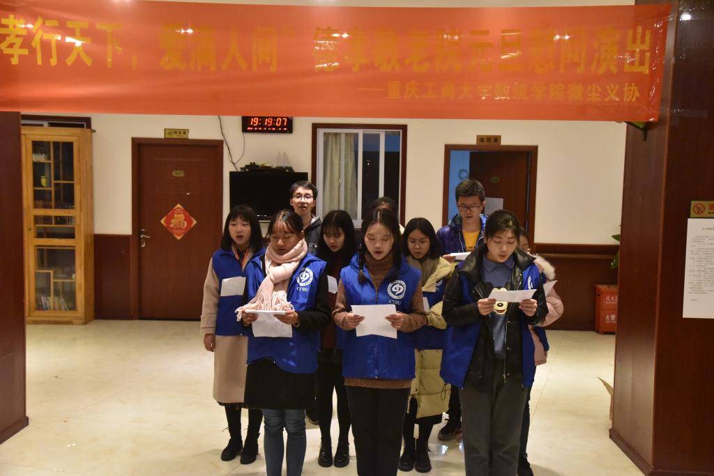 为弘扬“尊老、敬老、爱老”的优良传统,表达对敬老院老人们的关爱, 12月29日18:00,学院微尘义协志愿者们来到了江北区德孝敬老院,为老人们献上了主题为“孝行天下,爱满人间”的元旦慰问演出,陪老人度过了一个欢乐祥和的傍晚,让老人们在严寒的冬季感受到了骄阳般温暖。