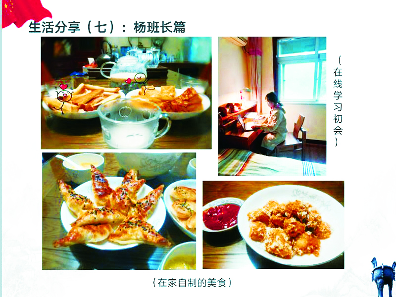 同学们积极地将自己所见所闻都分享在群里,有的分享了自己宅家的生活,有的同学厨艺大大提升,有的学习了历史……可以看出,大家都尽量地在使自己的生活过得更多姿多彩。 有的团支书还邀请班上的同学分享在防疫期间担任地方退役军人志愿者的感想。他说他由衷佩地服医务工作者们的辛勤付出和默默的努力,虽然他做的远不及那些抗疫一线的服务者们,但是通过这次防疫抗疫,他深刻地感受到了作为中国人的自豪。