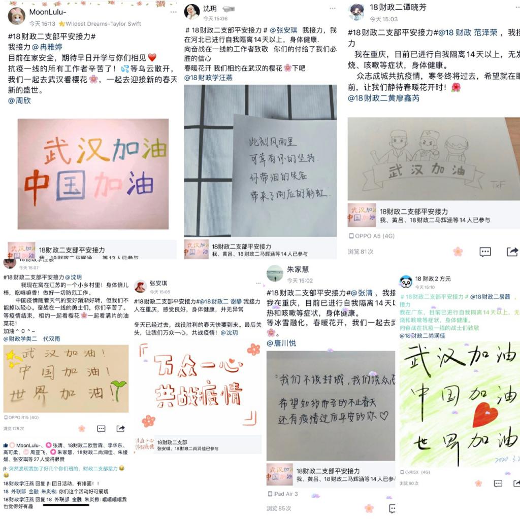 2018级财政二班团支部通过学习习近平总书记在中央政治局常委会会议研究应对新型冠状病毒肺炎疫情工作时的讲话,领会习总书记的重要指示精神,坚定同学们必胜的信念,打好疫情防控狙击战。全体同学发起QQ空间说说报平安活动,带上#18财政二支部平安接力#的话题标签,并附上自己手写的加油祝福语图片,@QQ好友接力。不仅在班级内部起到了警示作用,也在每位同学不同的社交圈内提醒了其他朋友们要保护好自己,少出门、尽量宅家。