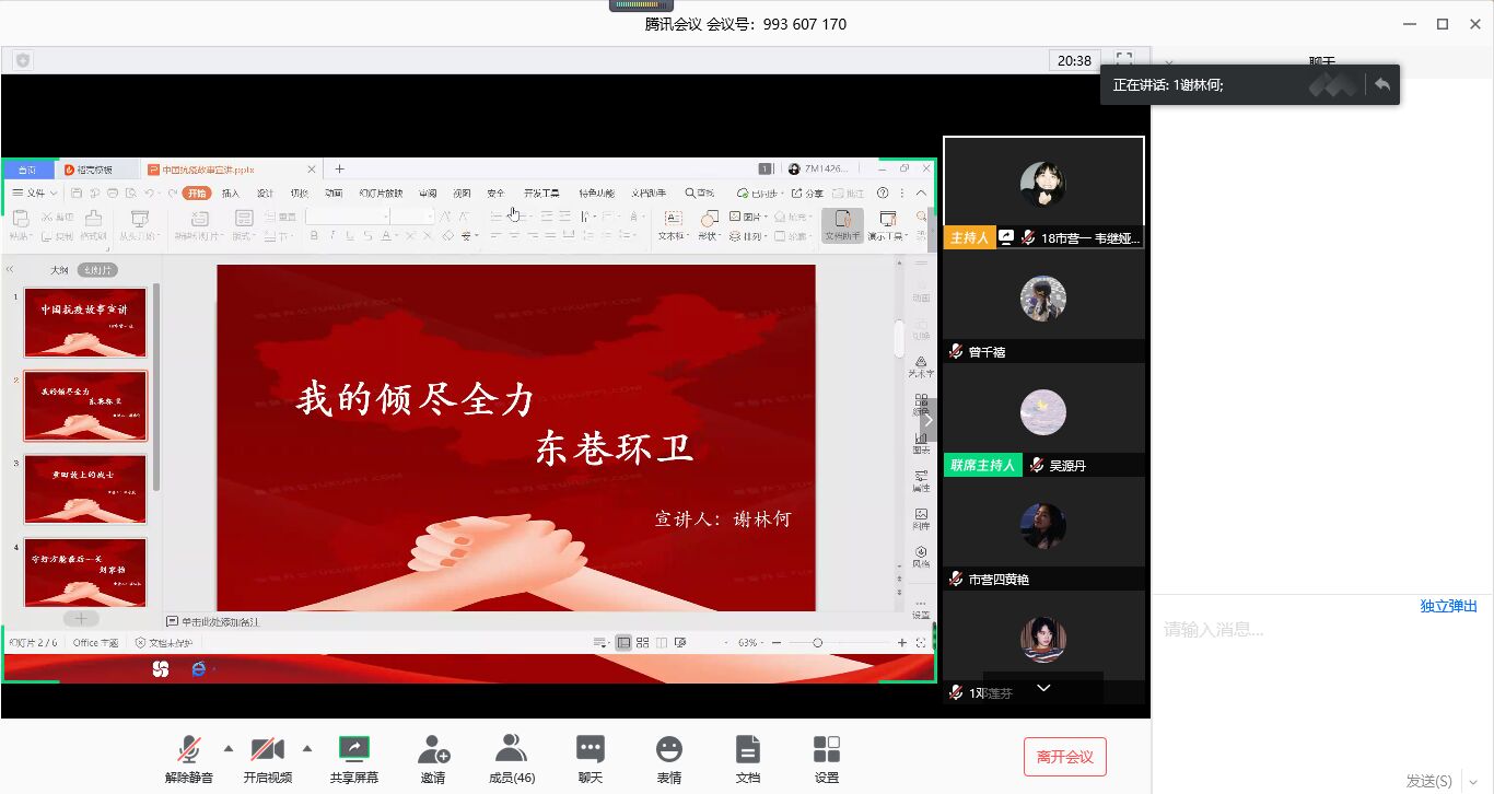 此次活动主要是以企业微信或者腾讯会议为直播平台,辅导员和全体学生充分参与。活动开始,各班主持人首先向大家介绍此次活动开展的内容、目的以及意义;宣讲期间,各个参赛选手准备充分,用PPT展示抗疫故事和抗疫期间涌现的一个个英雄人物,有些同学也配上应景的背景音乐,使宣讲活动更加具有感染力,或慷慨激昂或柔情舒缓,演讲者通过演讲与分享,使同学们进一步了解了一群特殊的逆行者,直播过程中大家积极开展互动,反响热烈。
