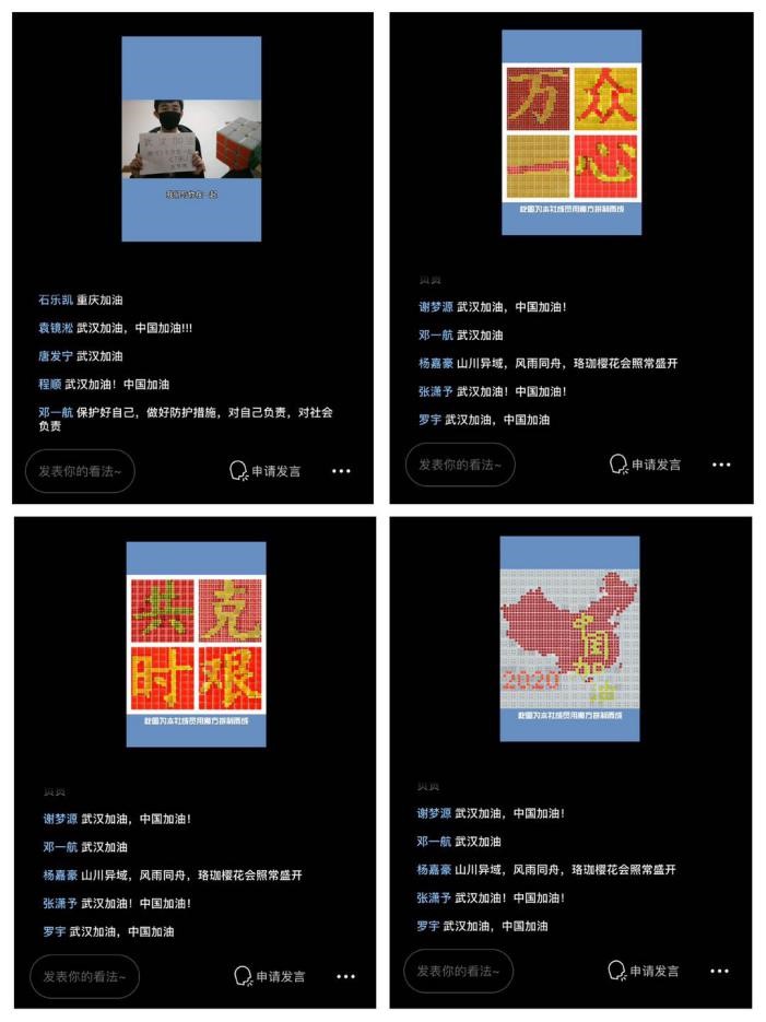 从未尝试过的线上魔方挑战赛掀起了活动的高潮,团员们通过直播模式一边回答主持人提出的防疫常识问题,一边要在一分钟以内还原打乱的魔方,一心二用的挑战模式给参赛选手带来了不小的挑战。最终,邓定洲同学以答对八个问题和在10秒钟之内还原出魔方的优异成绩夺冠。挑战赛以播放M魔方社成员共同制作的VLOG结尾,团员们利用魔方共同拼出“万众一心,共克时艰,中国加油”的字样,体现了支部团员对打赢防疫攻坚战的信心。