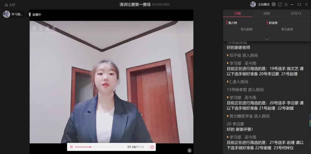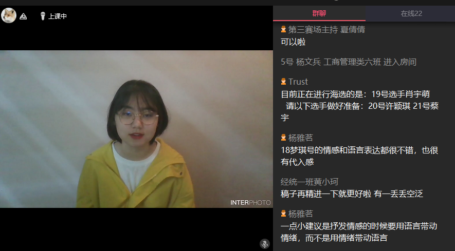 此次比赛以线上直播的形式开展,由参赛选手线上角逐、观众线上投票、以及评委们点评三部分组成。本次总决赛由许颖琪同学、李沿蒙同学等十名晋级选手进行激烈竞争。在比赛中,每位选手或文思敏捷、或妙语连珠,无不体现着同学们缜密的思维与充沛的精力,展现了同学们对祖国的热爱与赤诚。其中,荣获总决赛冠军的沈思宇同学的优秀发挥更是为诸多评委所称道。评委们切中要点的意见与建议,更是让选手和观众们获益颇多。最终结果由来自新闻班的沈思宇同学、来自市营五班的肖宇萌同学、以及来自贸经五班的易欣玥同学分别夺得本次总决赛的冠、亚、季军。