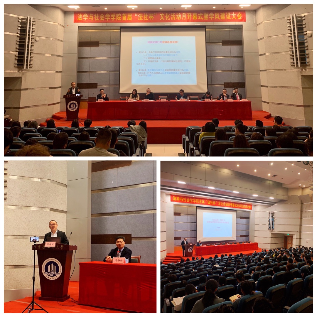 新时代、新使命、新作为,刚刚胜利召开的党的十九届五中全会为我国高等教育人才培养指引了方向。法学与社会学学院高度重视人才培养质量,不断探索和构建“三全育人”格局,在人才培养模式和途径上积极探索,多元协同,多维贯通,多层创新,努力提升育人质量。2020年11月11日,法社学院文化活动月开幕式暨学风建设大会在博智楼7100报告厅隆重召开,副校长李国军、学工部部长申卫东、校团委书记杨娟、西南政法大学马登科教授、侯国跃教授、范雪飞教授、包冰峰副教授、李俊副教授以及学院班子成员、教师代表、辅导员、本硕学生参加大会,会议由学院分党委副书记、纪委书记林璐主持。