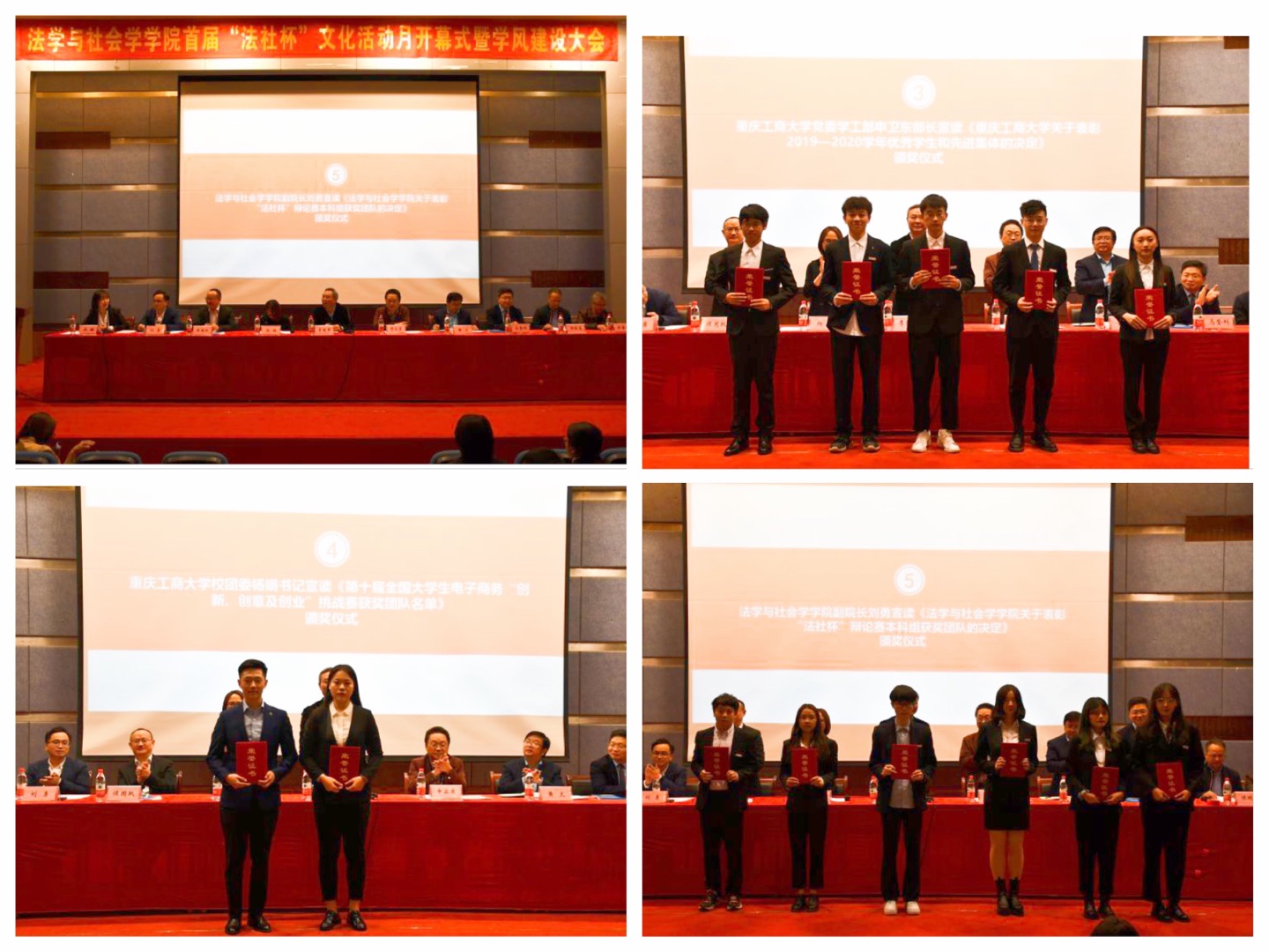 黄文院长介绍了文化月活动概况,学工部申卫东部长对2019-2020学年获得优良学风班、先进班集体的优秀班级给予了鼓励,校团委杨娟书记对学院在第十届全国大学生电子商务“创新、创意及创业”挑战赛中获得重庆市二等奖的团队予以表彰,副院长刘勇对在“法社杯”本科组辩论赛中表现优异的团队和辩手表示祝贺,副院长侯明喜对在社工论坛创新大赛校级赛中获奖的团队和个人表示了肯定。颁奖仪式在全体师生的掌声中将大会推向高潮。