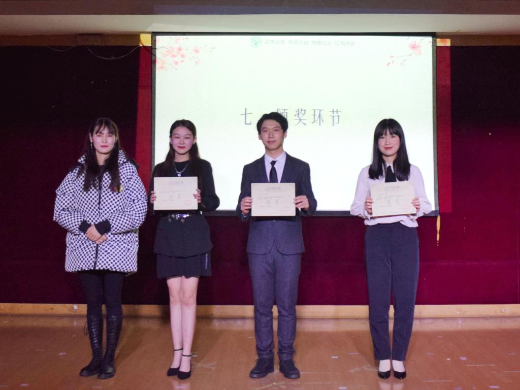 本场比赛共三轮,配音表演,模拟主持和即兴评述。第一轮九位决赛选手参与。第二轮晋级五名选手,由这五名选手角逐前三名。首先,令人记忆犹新的三场配音表演让观众们捧腹大笑。第二轮模拟主持环节更是精彩纷呈,每位选手分别抽签选取除夕、中秋、元宵、端午、七夕五个场景词进行模拟主持。每位选手竭尽所能,频出妙招。何禹宏同学凭借新中国改革的独到视角,表达出人民群众对2020年全面建成小康社会,打赢脱贫攻坚战的美好祝愿。刘英杰同学结合时事,在新冠疫情中,找寻相思。所谓有情人相隔两地,心却天涯咫尺。第三轮的即兴评述则更加精彩,各位选手分别就95后天才科学家曹原,90后村官,中国电子竞技等发表自己独到的见解,引入深思。最后,刘英杰同学以超强的情感共鸣力勇夺冠军。丁可心同学和何禹宏同学也毫不逊色,以自信从容的演说分别赢得亚军和季军。