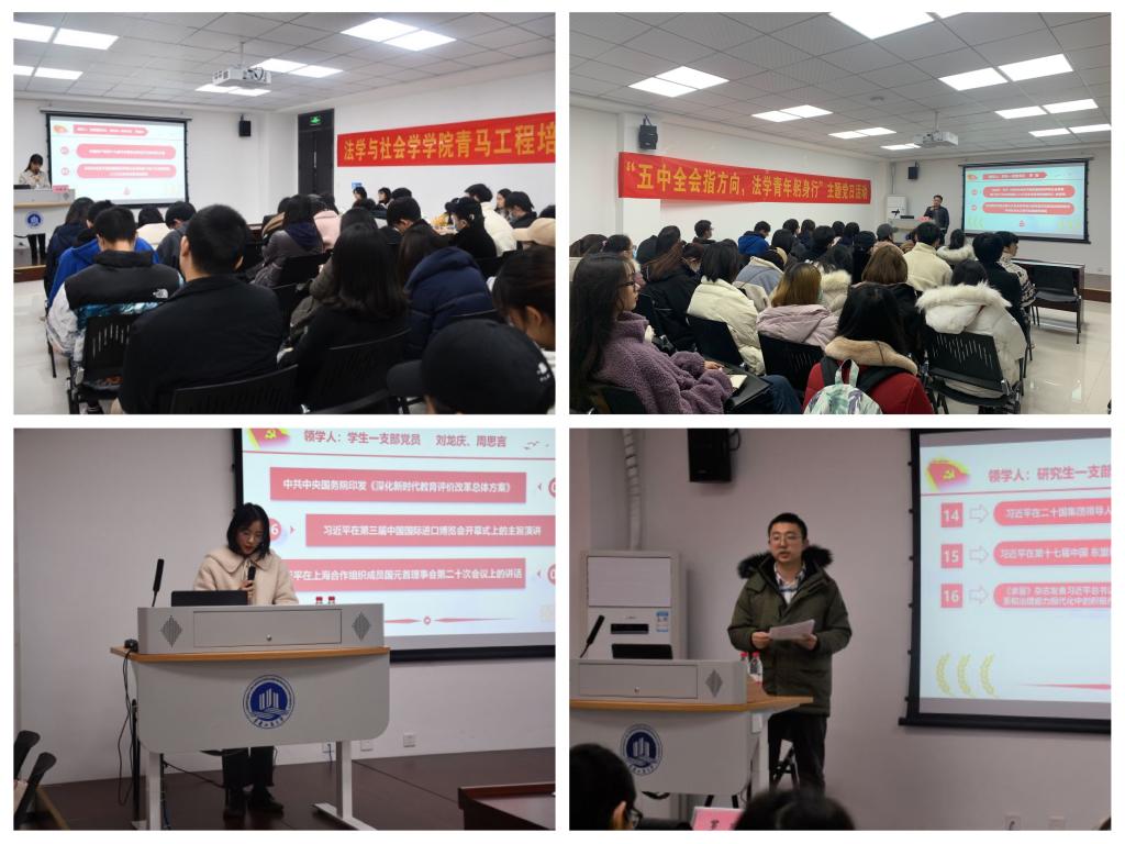 为深入贯彻落实习近平总书记系列重要讲话精神和党的十九大精神,引导党团学生干部主动学习和掌握党的第十九届五中全会精神,进一步坚定中国特色社会主义道路信念,法学与社会学学院于2020年12月18日下午2点在学生发展中心成功举办2020年青马工程培训暨“五中全会指方向,法学青年躬身行”主题党日活动,活动分为集中学习和法律义务咨询两个阶段。研究生一支部、学生一支部全体党员,分团委学生会主要成员,律动青年法学社学生代表,学院入党积极分子代表参加了本次活动。