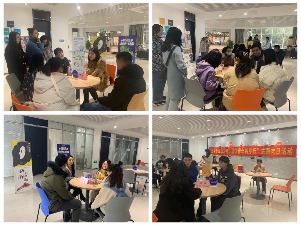 活动第二阶段由研究生一支部宣传委员初红漫老师、学生一支部组织委员公杰老师以及研究生党员代表、律动青年法学社代表为全校师生开展以防范金融电信诈骗为主题的法律义务咨询。活动现场展示了“防范金融电信诈骗”文创作品征集大赛的优秀作品,同学们用海报、手抄报、案例分析、书法作品等形式全面地分析和总结了防范诈骗和法律维权的方式方法。到场同学积极地咨询自己所遇到的法律问题和困惑,学会拿起法律的武器保护自己的合法权益。提供咨询的师生也公开留下了自己的咨询邮箱,着力为全校师生提供长期的法律义务咨询服务。咨询活动也提高了同学们的法律意识和防范意识,拉近了法与生活的距离,提高了同学们对学习法律的热情。