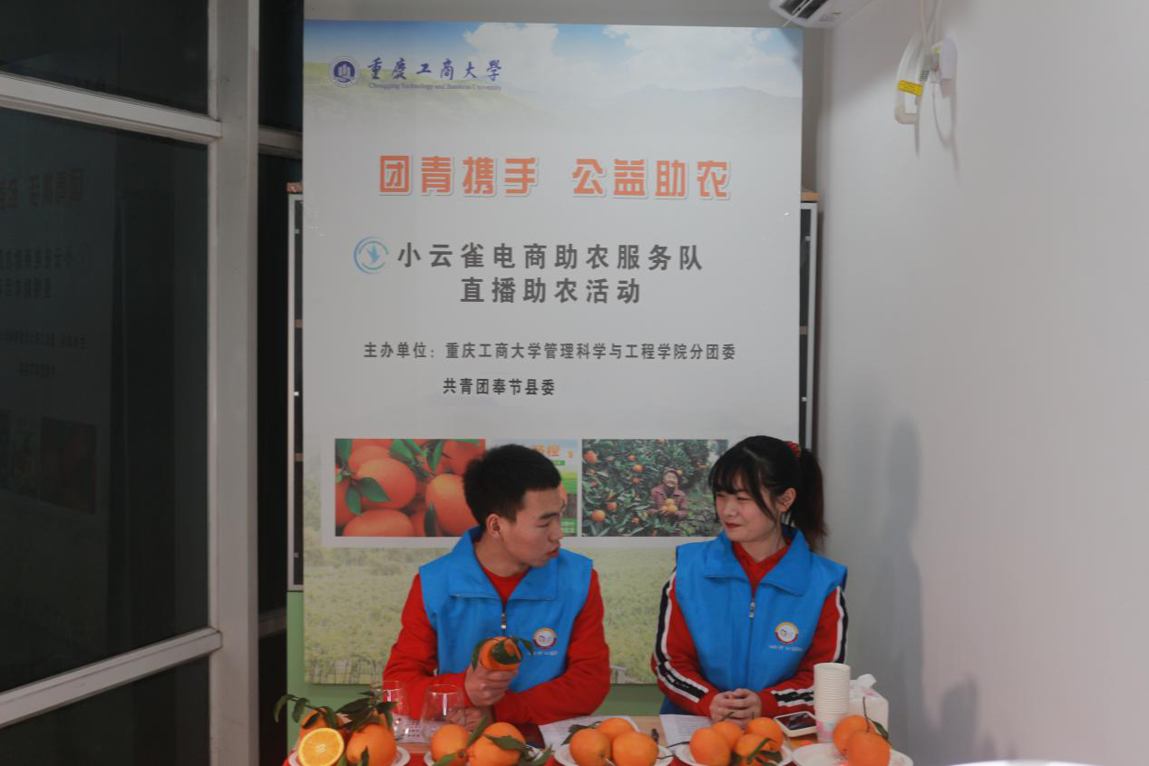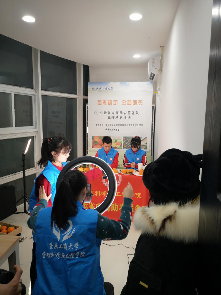 为响应习近平总书记在中央农村工作会议的号召,巩固拓展脱贫攻坚成果,助力乡村振兴,重庆工商大学管理科学与工程学院小云雀电商助农服务队携手共青团奉节县委在2020年12月31日开展直播助农活动,帮助奉节贫困农户销售滞销脐橙。