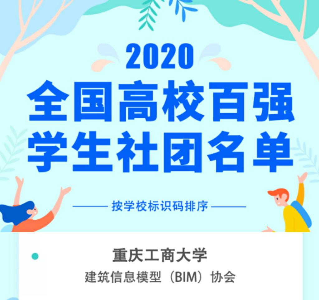 经过高校推荐、网络展示及投票、技术筛查、专家评审等环节,2020全国高校百强学生社团名单于6月15日正式公示。其中,重庆工商大学管理科学与工程学院工程管理专业BIM协会成功入选全国高校百强学生社团名单。