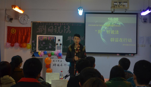 11月18日下午,财政金融学院2012级CFA团支部在博智楼07511教室成功举办“‘荆’日说法:辟谣在行动”主题团日活动。财政金融学院党总支刘代成副书记、校团委组织部部长陈琛老师、财政金融学院分团委书记周琴老师作为特邀嘉宾出席,来自全校各学院的学生会干部代表及2012级CFA团支部全体同学参加了活动。