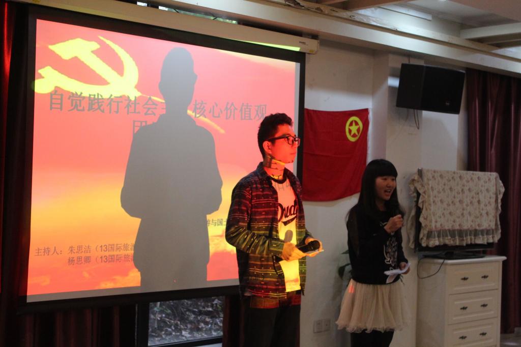 2015年3月27日下午,为响应党的号召,由旅游与国土资源学院团委学生会主办,13级旅管一、二支部和国旅一支部、酒店一支部承办的 “自觉践行社会主义核心价值观”特色团日活动于教职工活动中心成功举办。出席本次活动的嘉宾有校团委组织部、旅游与国土资源学院分团委学生会的老师和同学们。