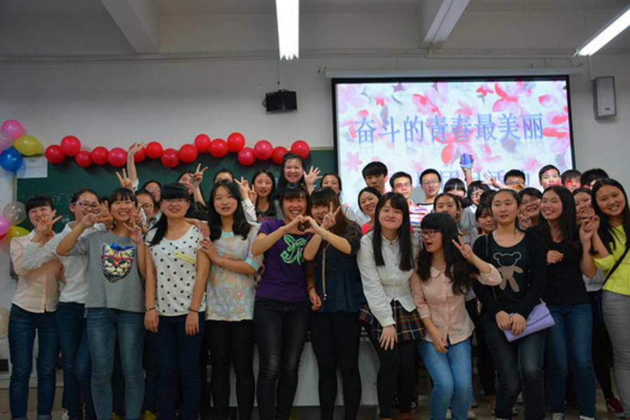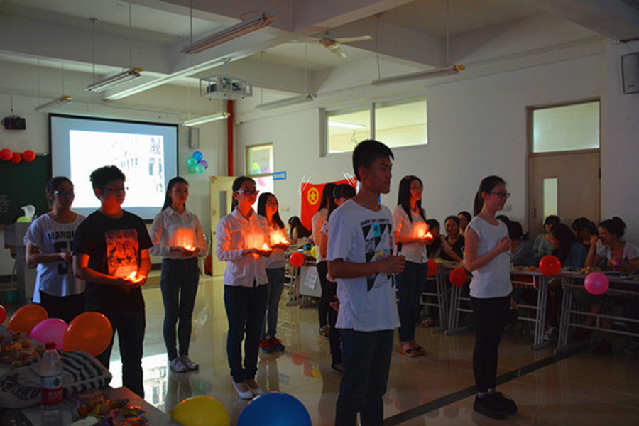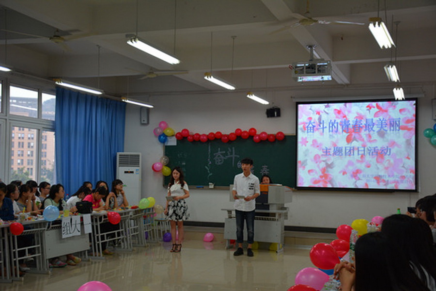 团日活动在同学们合唱《共青团之歌》的歌声中拉开帷幕,一个视频短片带着我们一起体味了共青团光荣发展的九十载,加深了同学们对共青团的认识。随后的知识竞答环节通过问答的形式让同学们在了解共青团发展历史的同时,也体会到了作为一名共青团员的光荣。此外,同学们也在本次团日活动中尽情展示着自己的才华,让观众们倾听了闻一多的《一天》诗朗诵;观看了自制影视《什么是奋斗的青春》 ;欣赏了舞蹈:《Trouble Maker》,精彩的表演赢得了阵阵。之后进入了游戏环节,手机炸弹、你比我猜、盲人闯关等趣味横生的互动游戏一度将活动推向高潮,整个教室充斥着大家的呼喊与欢笑,大家是既紧张又轻松,真正的享受其中,体会到其中的乐趣,游戏中最后比分最高的小组获得了丰富的奖品。在欢声笑语中,同学们合影留念,为本次团日活动画上句号。