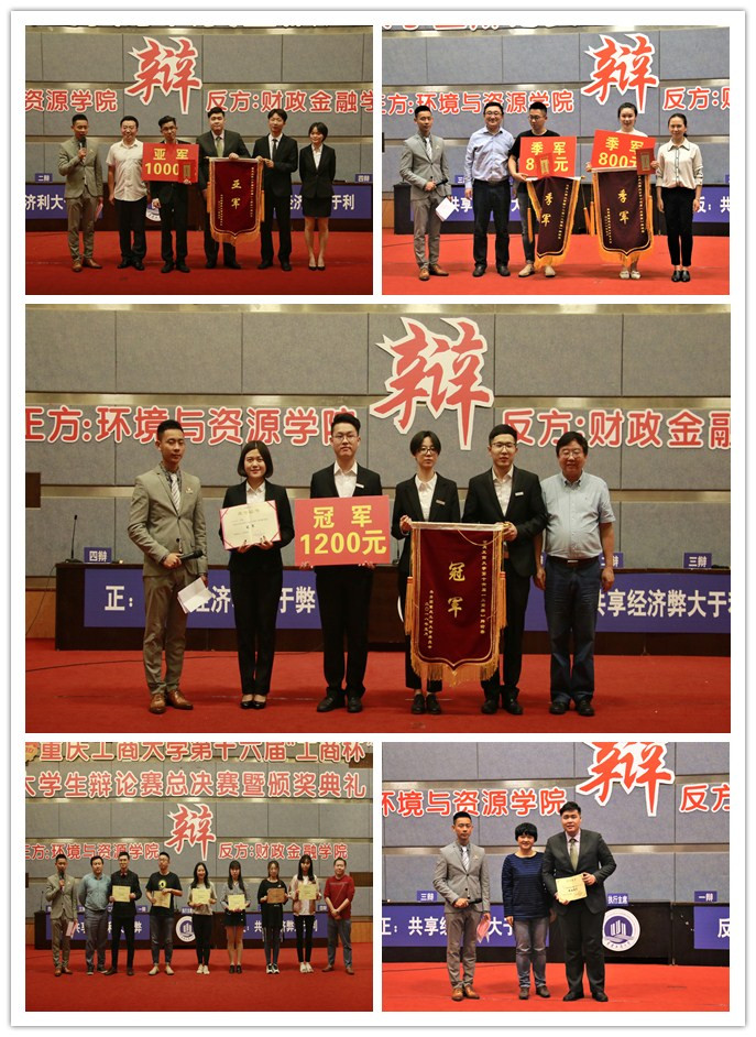 进入决赛的是财政金融学院辩论队、环境与资源学院辩论队,双方就“共享经济利大于弊/弊大于利”展开辩论。作为正方的环境与资源学院以“共享经济利大于弊”为观点对战持“共享经济弊大于利”观点的财政金融学院。首先,正方辩手开宗明义,从分析基础资源闲置、优质资源稀缺的现状和共享经济发展的趋势阐明了共享经济对提高资源利用率的作用,同时引用生活典例,如养老、教育、医疗等问题,有力地论证了己方观点。反方辩手毫不示弱,沉着应对,提出了共享经济会提高社会成本,占用社会资源的观点,并从另外一个角度剖析共享经济的蓬勃发展容易导致恶性竞争从而破坏市场规则,影响经济的正常运行。双方辩手引经据典、旁征博引,比赛精彩纷呈,双方辩手都充分展现了自身的睿智、沉稳和机敏。最终,财政金融学院更胜一筹,赢得了本场比赛的胜利。西南政法大学的王安白教授对比赛进行了点评,对选手的辩论技巧,辩论风格等给予了指导。来自各学院辩论队的优秀辩手也在现场分享了自己的辩论经历和心得。随后,进行了颁奖典礼。财政金融学院荣获本届“工商杯”辩论赛的冠军,环境与资源学院获得亚军,研究生院、经济学院获得季军;管理学院龚施菡、文学与新闻学院刘雨静、商务策划学院杨小慧、会计学院王齐吁、经济学院梁笑天和研究生学院谭潇六位同学获得本届比赛“优秀辩手”。