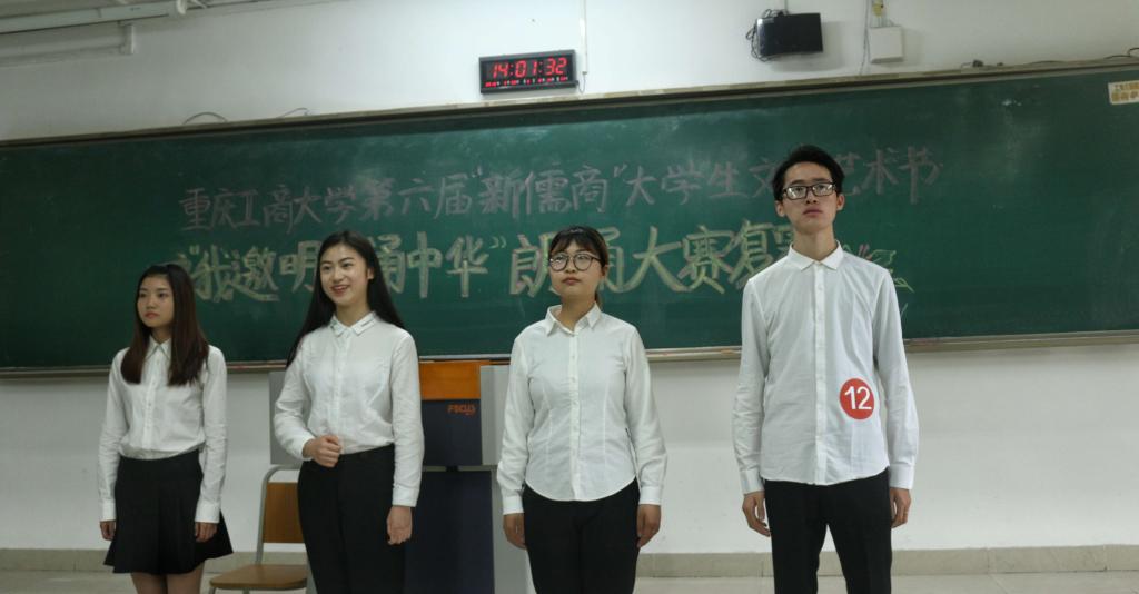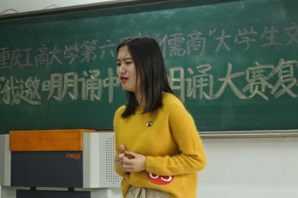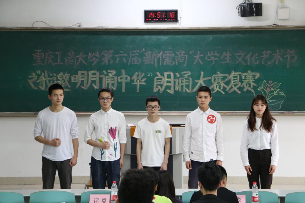 迎着春风,歌颂中华。2018年3月30日13:00,由校团委主办,商务策划学院分团委学生会承办的重庆工商大学第六届“新儒商”大学生文化艺术节之朗诵大赛复赛于南岸校区博智楼7121阶梯教室举行。此次比赛的评委有重庆市普通话水平测试员张彦女士、校团委王灿老师、校大学生艺术团指导老师封海粟老师。来自各学院的28组选手经过激烈角逐,最终有12组选手进入决赛。
