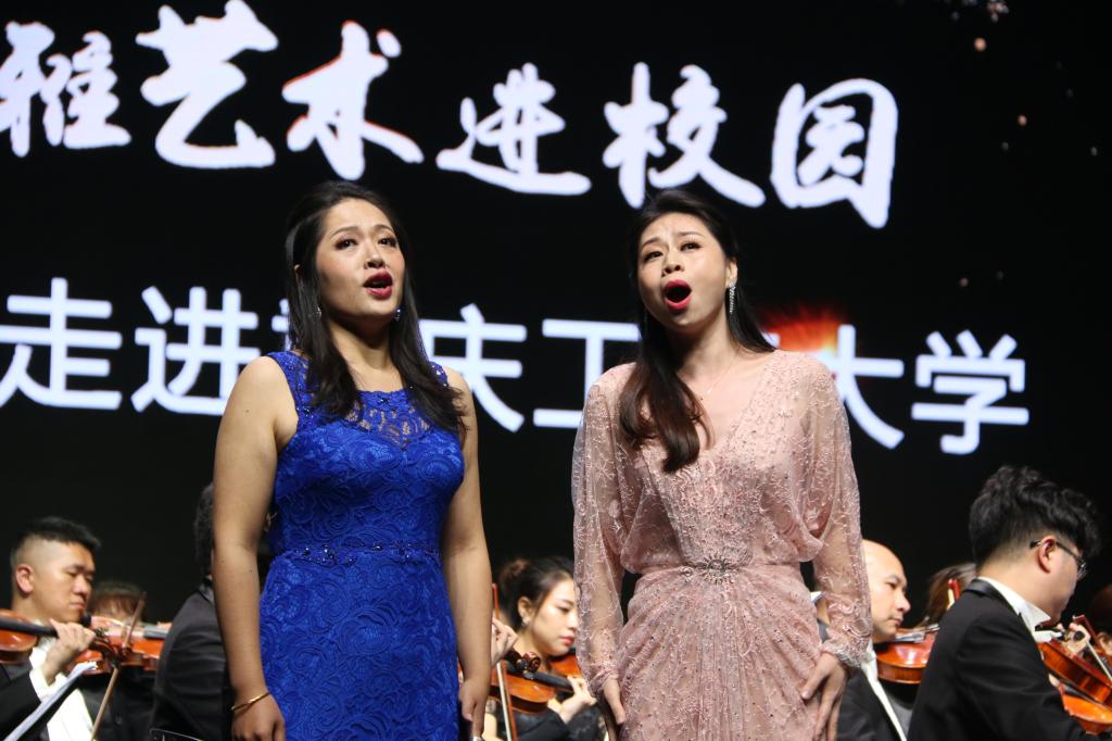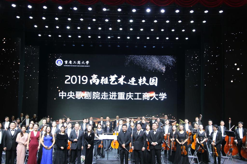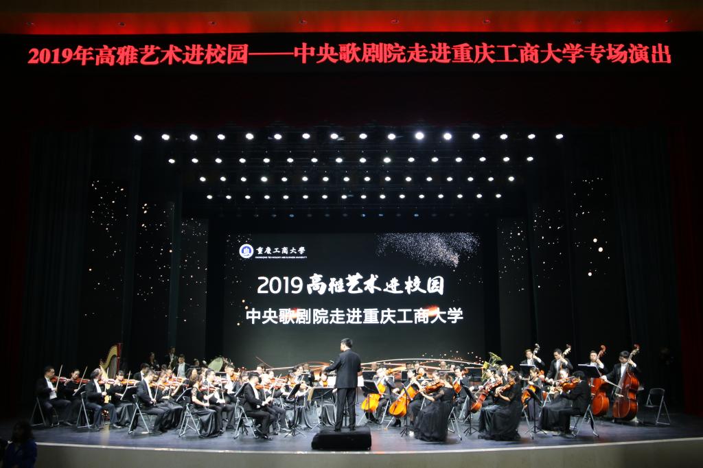 10月20日19:00,为全面落实习近平总书记在全国教育大会上重要讲话精神,推动中华优秀传统文化创造性转化、创新性发展,让广大青年学生在艺术学习的过程中了解中华文化变迁,触摸中华文化脉络,汲取中华文化艺术的精髓,提高审美和人文素养,培养德智体美劳全面发展的社会主义建设者和接班人,由教育部、文化和旅游部、财政部主办,重庆工商大学承办的“高雅艺术进校园——中央歌剧院走进重庆工商大学”在重庆工商大学剧场举行,中央歌剧院男中音歌唱家王立民先生、女中音歌唱家孙雪曼女士担任主持人。音乐会现场座无虚席,近千位师生共同观看演出,一起享受一场交响乐的视听盛宴。