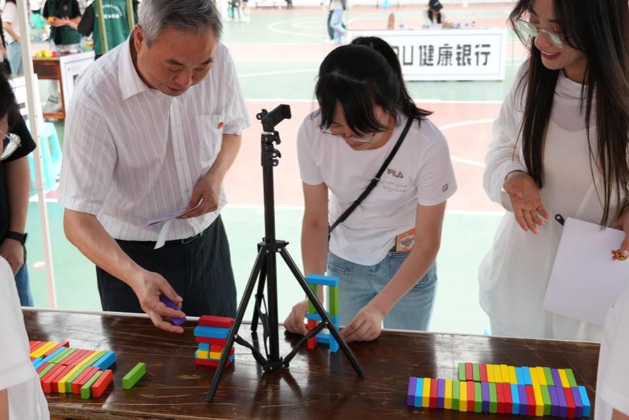 活动现场,六大社团协同构建了沉浸式 “金融心理健康银行”,在金融学院红岩金盾功能型党支部的指导下,以模拟银行业务的形式,设置储蓄、借贷、投资三大核心窗口,每个窗口都成为社团特色与育人功能深度融合的生动实践。在储蓄窗口,同学们精心设计“情绪储蓄单”,引导大家将焦虑、压力等“坏心情” 具象化填写存入“情绪银行”,帮助同学们完成情绪释放与心理减负;在借贷窗口,M魔方社、南山传统文化交流研习社、金融证券协会、瀚轩棋社、十指手工社、计算机协会等多个学生社团设计了情绪光谱、华服织梦、积木筑基、对奕愉情、专注点钞等各种心理闯关小游戏,助力学生贷出自信、美丽、诚信、睿智、技能、专注等健康心理品质勋章,在趣味中学会情绪管理与心理调适;在投资理财窗口,同学们通过答题、绘制心情 K 线图、模拟股票交易等活动,在实践金融知识的同时,关注自身情绪波动。