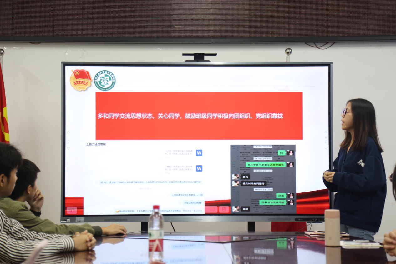 22级土地资源管理专业二班团支书李雨晴、22级城市管理专业团支书何红晴,作为五星优秀团支部代表分别从团务工作、三会两制一课以及如何组织班级在团支部对标定级和五四评优中取得优异成绩等方面进行了工作经验分享。分享结束,各位团干就工作过程中遇到的问题进行了经验交流。