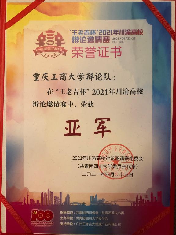 为引导川渝地区青年大学生积极思考、建言献策,主动融入成渝地区双城经济圈建设,彰显新时代大学生的思辨精神,促进川渝地区高校青年大学生的深入交流,加强川渝地区高校在思辨文化育人工作上的深度合作。4月23日至25日,来自川渝的共8所高校——四川大学、电子科技大学、西南财经大学、西南交通大学、西南政法大学、西南大学、重庆大学、重庆工商大学,汇聚在四川大学江安校区的校园参与2021“王老吉杯”川渝高校辩论赛,展开为期两天的激烈辩论。最终,我校辩论队喜获2021“王老吉杯”川渝高校辩论邀请赛亚军,校辩论队成员刘薪雨荣获优秀辩手称号。