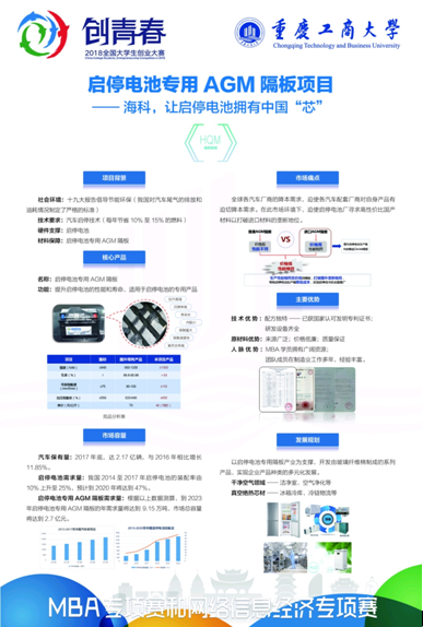 我校获奖项目《启停电池专用AGM隔板》指导老师为MBA教育中心主任任毅教授,团队成员由2017级工商管理专业研究生刘欣、王大鹏、刘卫伟、2016级企业管理专业研究生夏泽慧和会计学专业研究生刘谊组成。该项目秉承“持续创新,实业兴邦”的理念,致力于提供高性价比的启停电池专用隔板,打破国外垄断格局,让启停电池拥有中国“芯”。团队成员准备充分,配合默契,以专业、自信的解答赢得评委的一致认可。